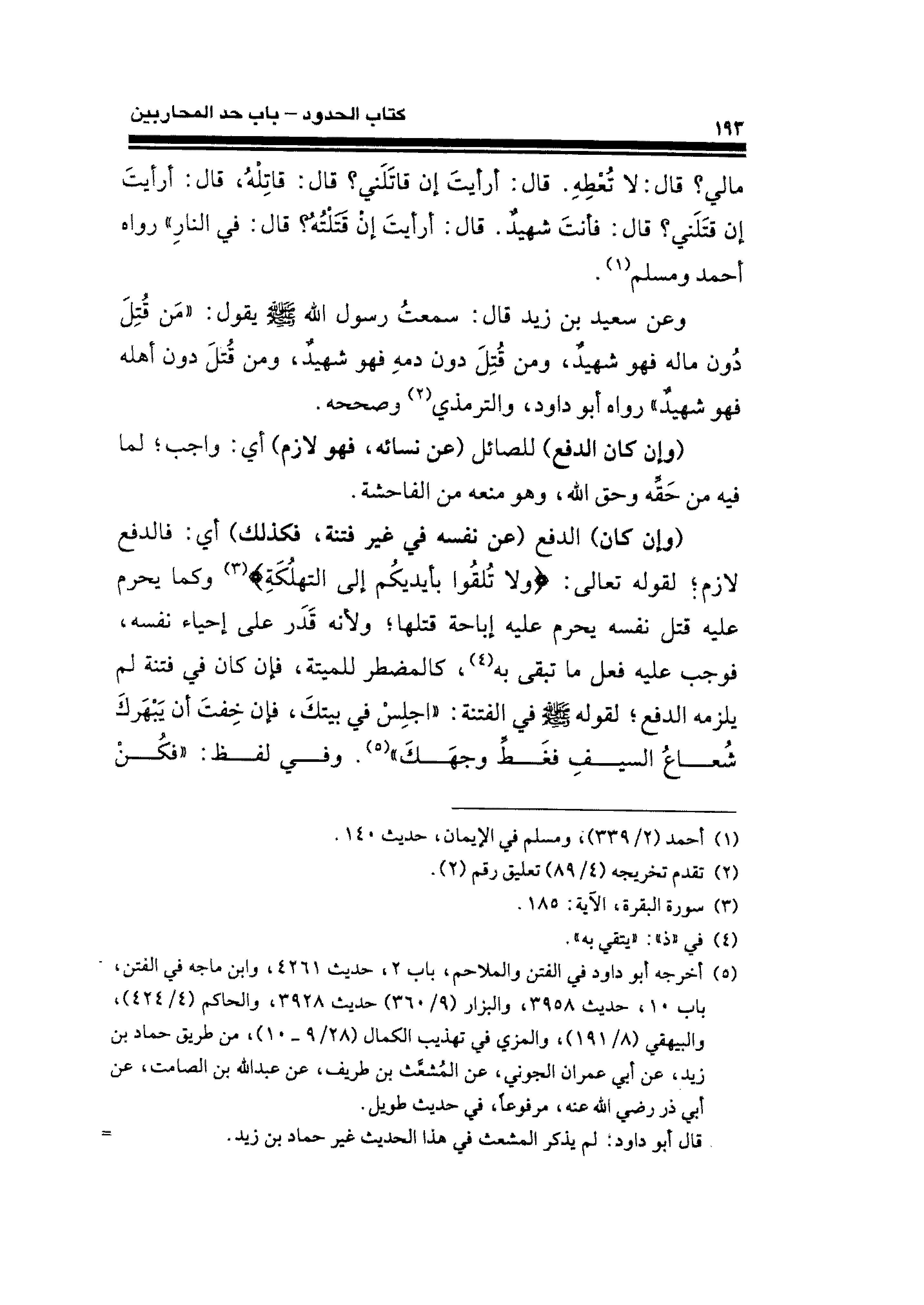 وعن سعيد بن زيد قال: سمعتُ رسول الله - صلى الله عليه وسلم - يقول: "مَن قتِلَ دُون ماله فهو شهيدٌ، ومن قُتِلَ دون دمهِ فهو شهيدٌ، ومن قُتل دون أهله فهو شهيدٌ" رواه أبو داود، والترمذي (¬٢) وصححه.