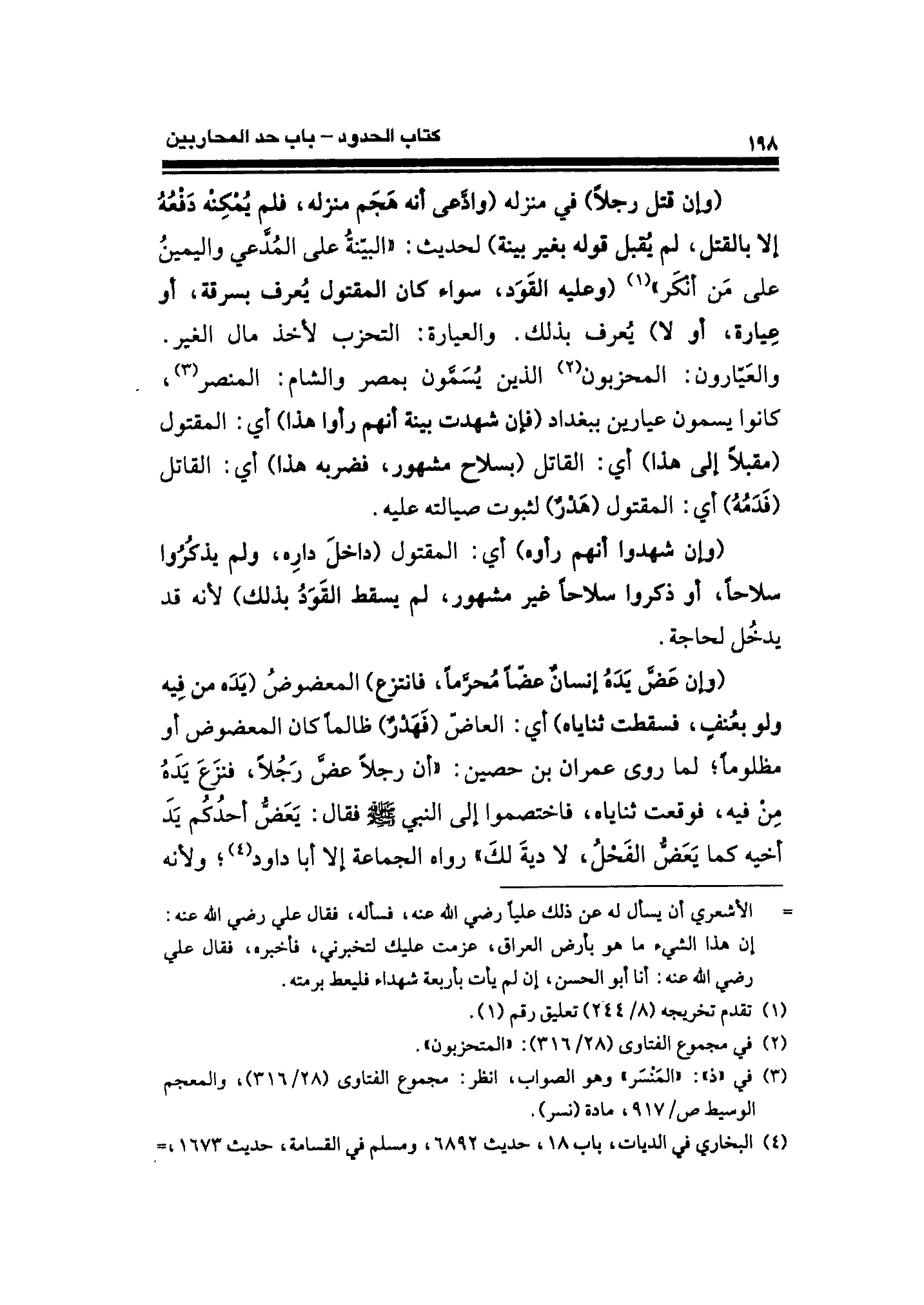 والعَيَّارون: المحزبون (¬٢) الذين يُسَمُّون بمصر والشام: المنصر (¬٣)، كانوا يسمون عيارين ببغداد (فإن شهدت بينة أنهم رأوا هذا) أي: المقتول (مقبلًا إلى هذا) أي: القاتل (بسلاح مشهور، فضربه هذا) أي: القاتل (فَدَمُهُ) أي: المقتول (هَدْرٌ) لثبوت صيالته عليه.