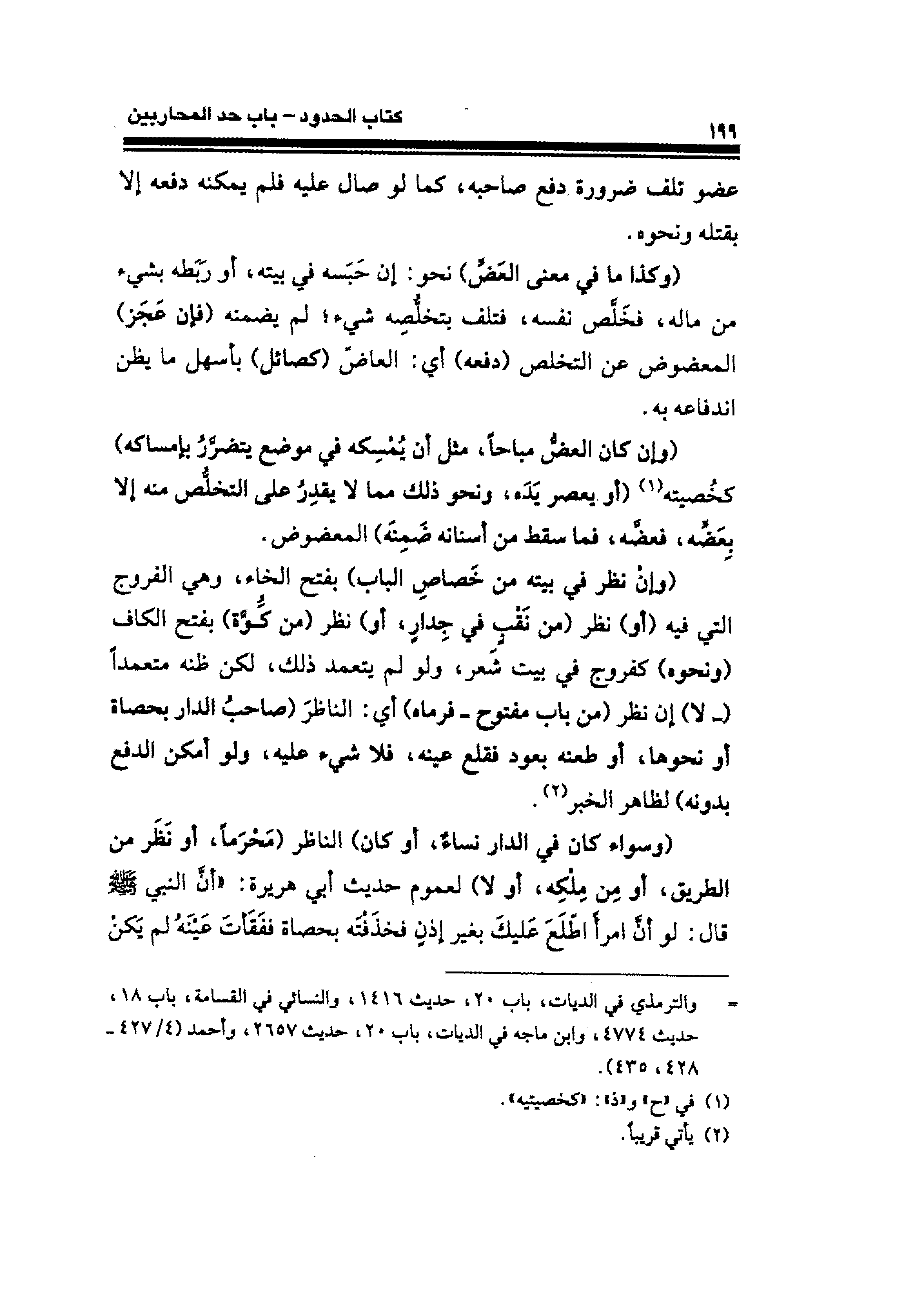 (وإن نظر في بيته في خَصاصِ الباب) بفتح الخَاء، وهي الفروج التي فيه (أو) نظر (من نَقْبٍ في جِدارٍ، أو) نظر (من كُّوَّة) بفتح الكاف (ونحوه) كفروج في بيت شَعر، ولو لم يتعمد ذلك، لكن ظنه متعمدًا (- لا) إن نظر (من باب مفتوح- فرماه) أي: الناظرَ (صاحب الدار بحصاة أو نحوها، أو طعنه بعود فقلع عينه، فلا شيء عليه، ولو أمكن الدفع بدونه) لظاهر الخبر (¬٢).