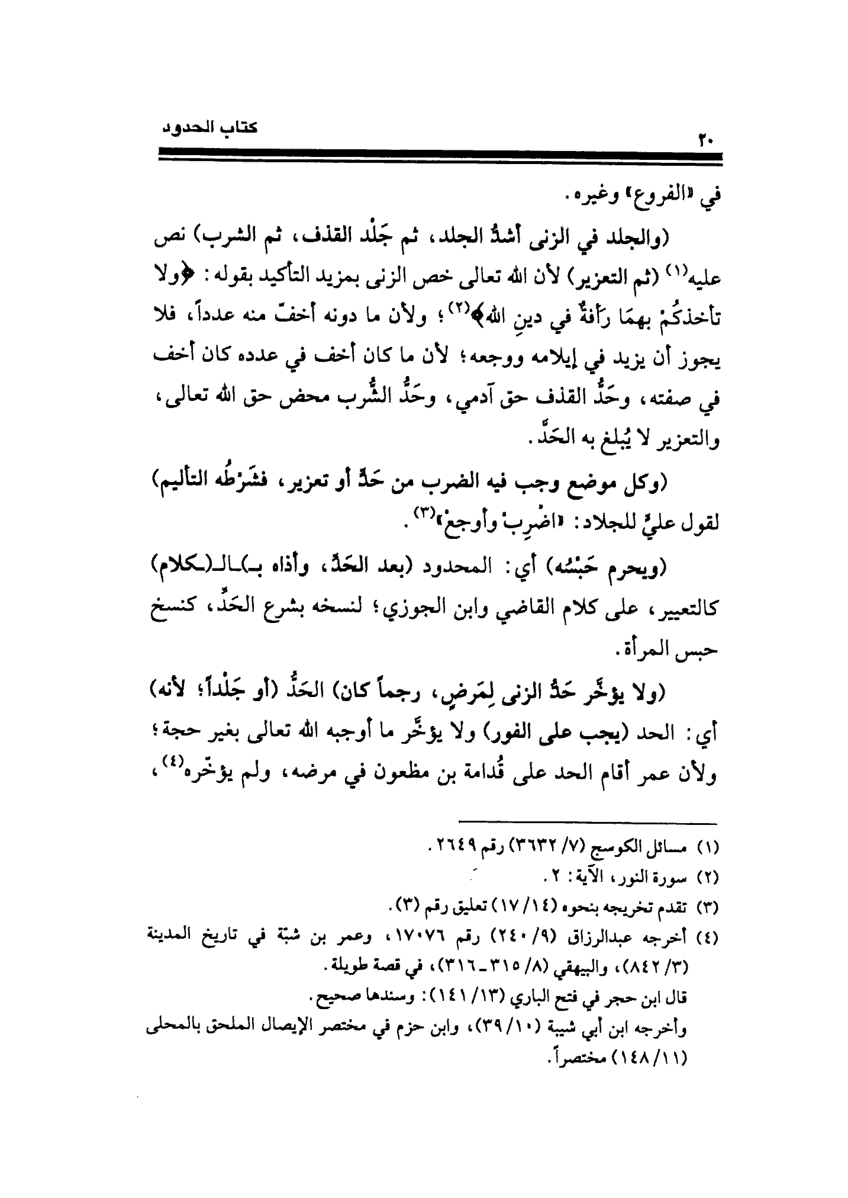 (ولا يؤخَّر حَدُّ الزني لِمَرضٍ، رجمًاكان) الحَدُّ (أو جَلْدًا؛ لأنه) أي: الحد (يجب على الفور) ولا يؤخَّر ما أوجبه الله تعالى بغير حجة؛ ولأن عمر أقام الحد على قُدامة بن مظعون في مرضه، ولم يؤخِّره (¬٤)،