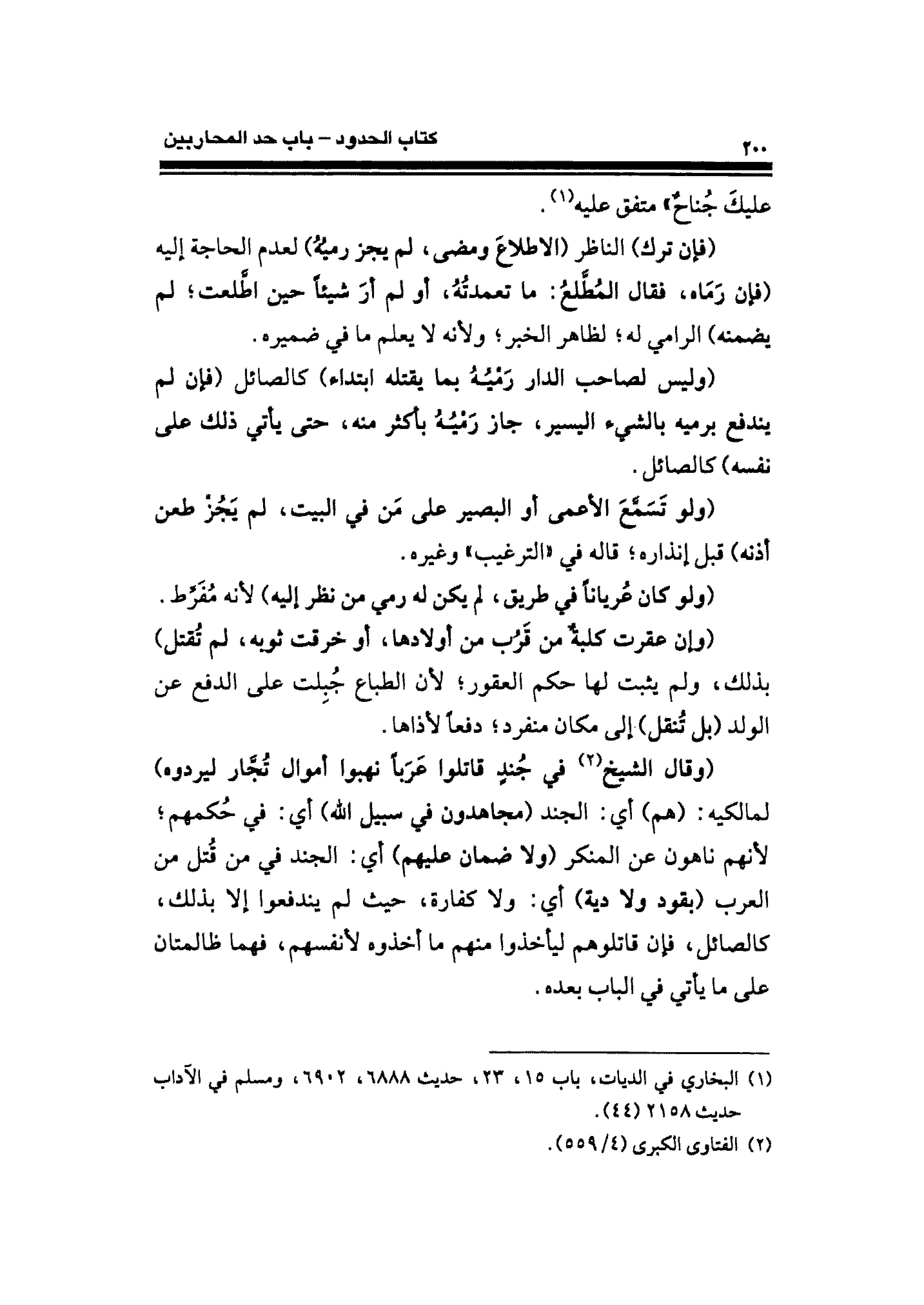 (وقال الشيخ (¬٢) في جُندٍ قاتلوا عَرَبًا نهبوا أموال تُجار لردوه) لمالكيه: (هم) أي: الجند (مجاهدون في سبيل الله) أي: في حُكمهم؛ لأنهم ناهون عن المنكر (ولا ضمان عليهم) أي: الجند في من قُتل من العرب (بقود ولا دية) أي: ولا كفارة، حيث لم يندفعوا إلَّا بذلك، كالصائل، فإن قاتلوهم ليأخذوا منهم ما أخذوه لأنفسهم، فهما ظالمتان على ما يأتي في الباب بعده.