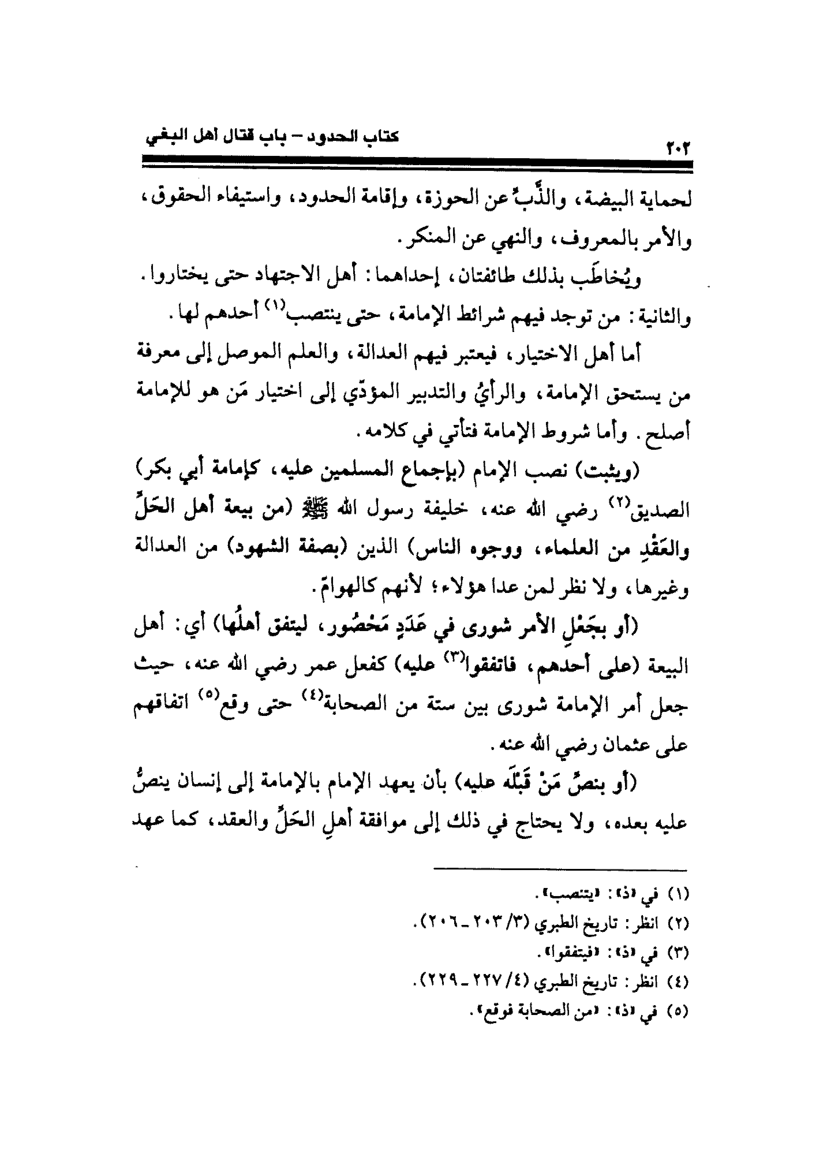 (أو بجَعْلِ الأمر شورى في عدَدٍ مَحصُور، ليتفق أهلُها) أي: أهل البيعة (على أحدهم، فاتفقوا (¬٣) عليه) كفعل عمر -رَضِيَ الله عَنْهُ-، حيث جعل أمر الإمامة شورى بين ستة من الصَّحَابَة (¬٤) حتَّى وقع (¬٥) اتفاقهم على عثمان رضي الله عنه.