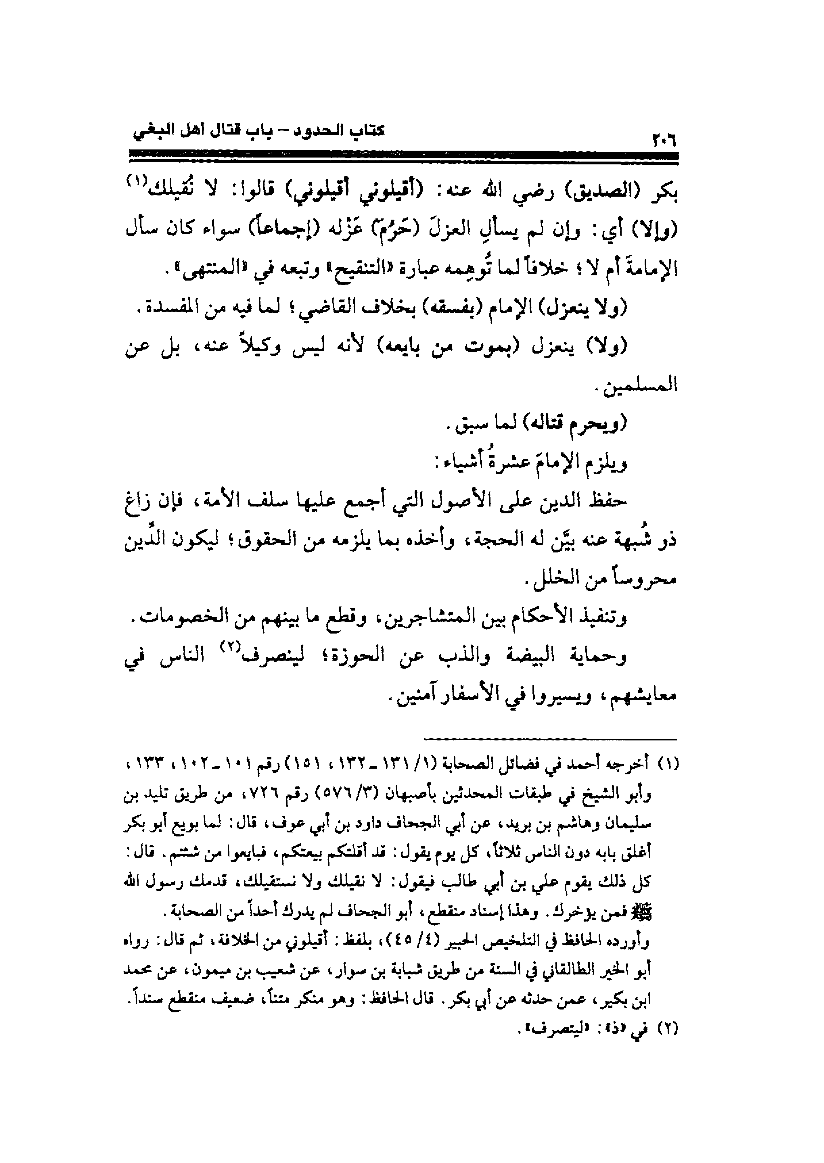 بكر (الصديق) رضي الله عنه: (أقيلوني أقيلوني) قالوا: لا نُقيلك (¬١) (وإلا) أي: وإن لم يسألِ العزلَ (حَرم) عَزْله (إجماعًا) سواء كان سأل الإمامةَ أم لا؛ خلافًا لما تُوهِمه عبارة (التنقيح) وتبعه في "المنتهى".