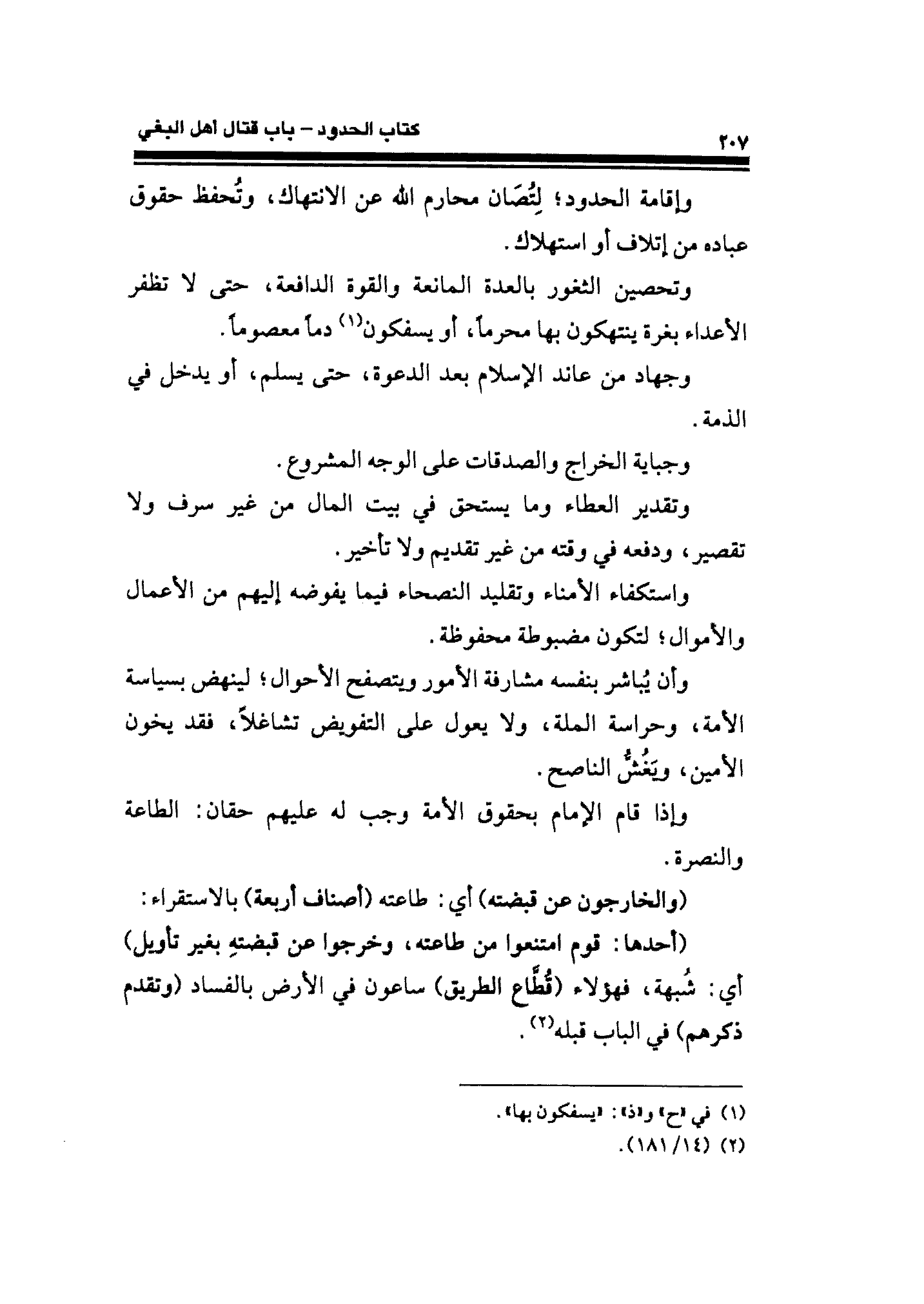 (أحدها: قوم امتنعوا من طاعته، وخرجوا عن قبضتهِ بغير تأويل) أي: شُبهة، فهؤلاء (قُطَّاع الطريق) ساعون في الأرض بالفساد (وتقدم ذكرهم) في الباب قبله (¬٢).