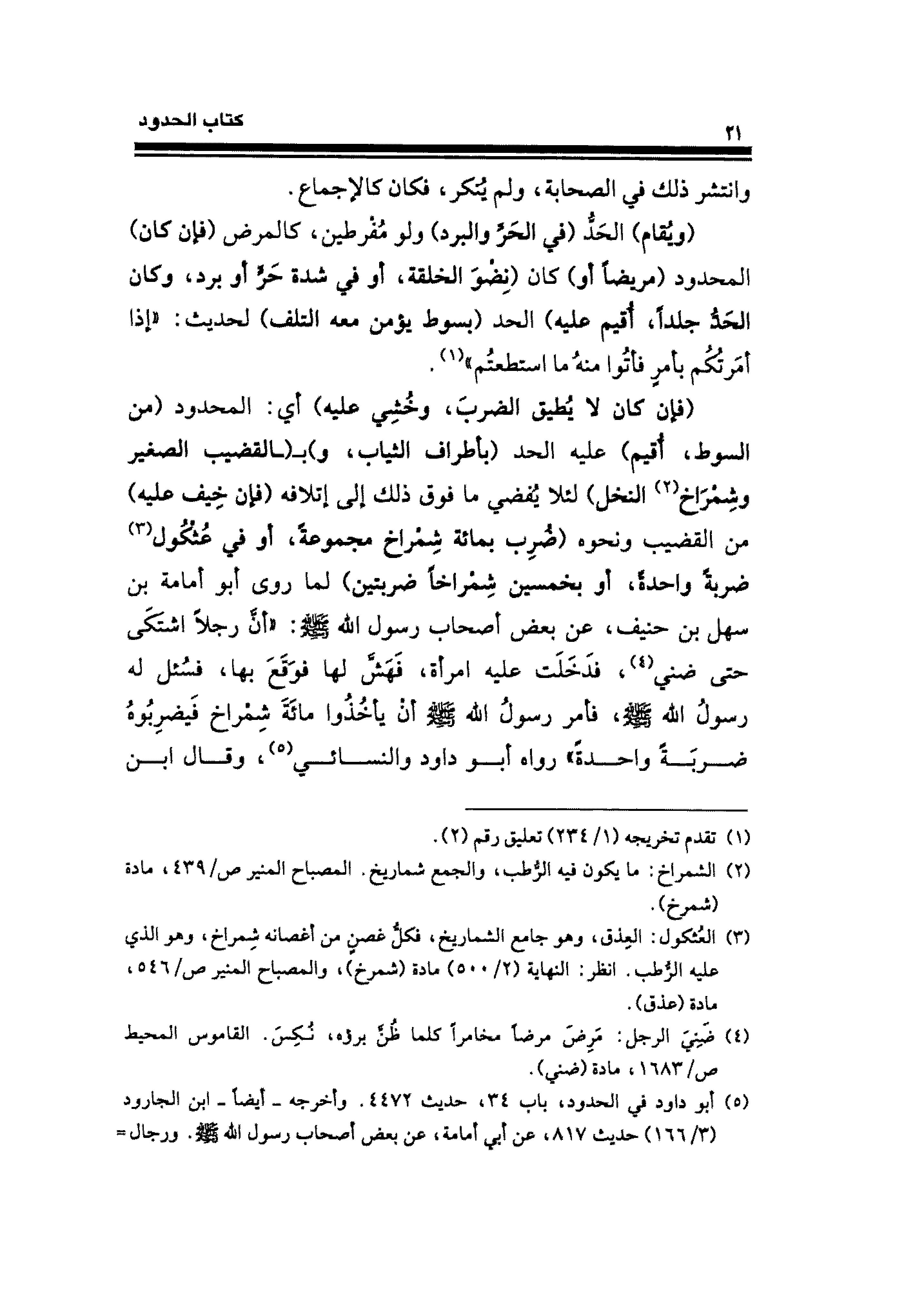 (فإن كان لا يُطيق الضربَ، وحُشِي عليه) أي: المحدود (من السوط، أُقيم) عليه الحد (بأطراف الثياب، و) بـ (ـالقضيب الصغير وشِمْرَاخ (¬٢) النخل) لئلا يُقضي ما فوق ذلك إلى إتلافه (فإن خِيف عليه) من القضيب ونحوه (ضُرِب بمائة شِمراخ مجموعةً، أو في عُثُكُول (¬٣) ضربةً واحدةً، أو بخمسين شِمْراخًا ضربتين) لما روى أبو أمامة بن سهل بن حنيف، عن بعض أصحاب رسول الله - صلى الله عليه وسلم -: "أنَّ رجلًا اشتكَى حتَّى ضني (¬٤)، فدَخَلَت عليه امرأة، فَهَشَ لها فوَقَعَ بها، فسُئل له رسول الله - صلى الله عليه وسلم -، فأمر رسول الله - صلى الله عليه وسلم - أن يأخُذُوا مائة شِمْراخ فَيضرِبُوهُ ضربَةً واحدةً" رواه أبو داود والنسائي (¬٥)، وقال ابن