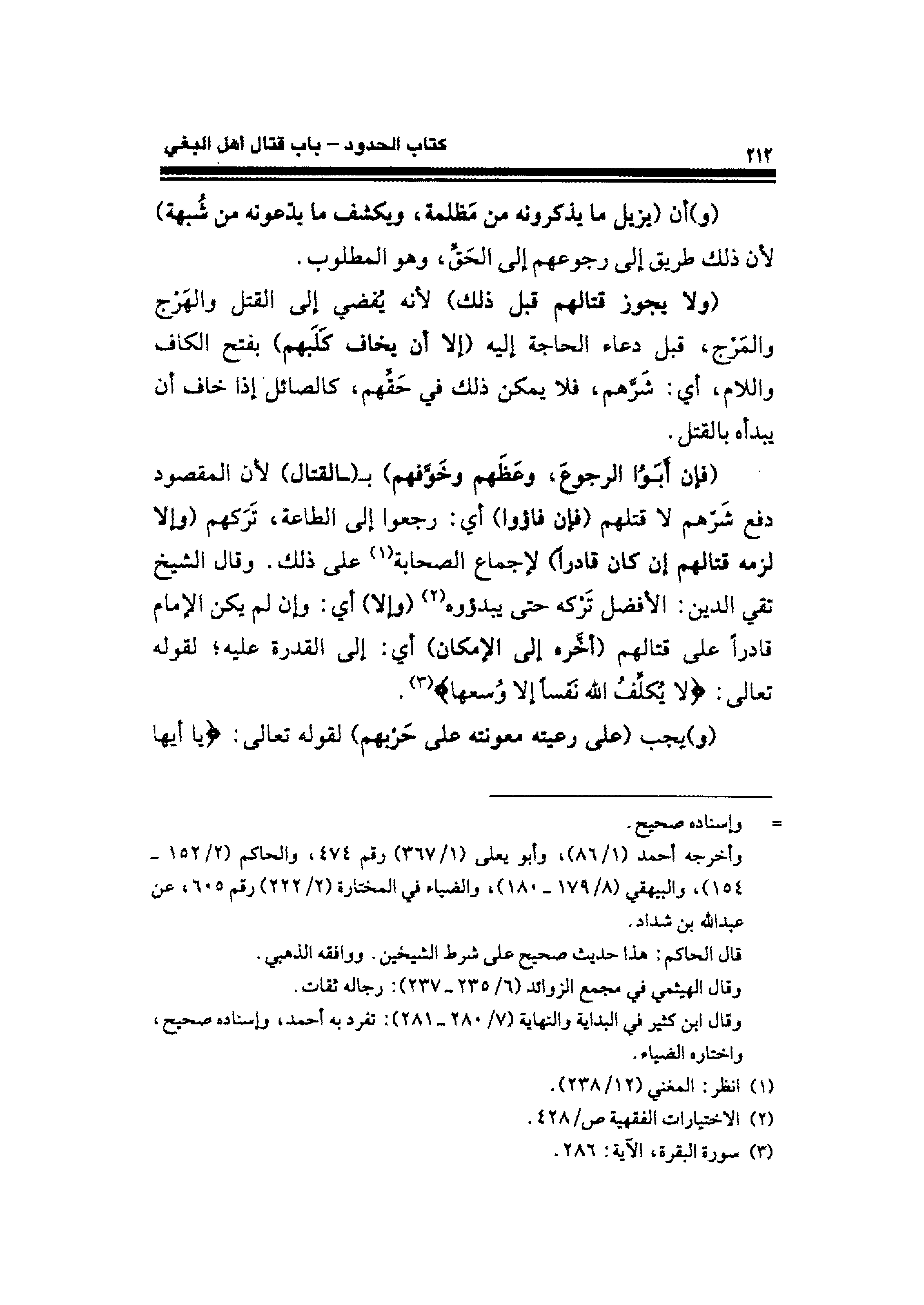 (فإن أبَوُا الرجوعَ، وعَظَهم وخَوَّفهم) بـ (القتال) لأن المقصود دفع شَرهم لا قتلهم (فإن فاؤوا) أي: رجعوا إلى الطاعة، تَرَكهم (وإلا لزمه قتالهم إن كان قادرًا لإجماع الصحابة (¬١) على ذلك. وقال الشيخ تقي الدين: الأفضل تركه حتى يبدؤوه (¬٢) (وإلا) أي: وإن لم يكن الإمام قادرًا على قتالهم (أخَّره إلى الإمكان) أي: إلى القدرة عليه؛ لقوله تعالى: {لَا يُكَلِّفُ اللَّهُ نَفْسًا إلا وُسْعَهَا} (¬٣).