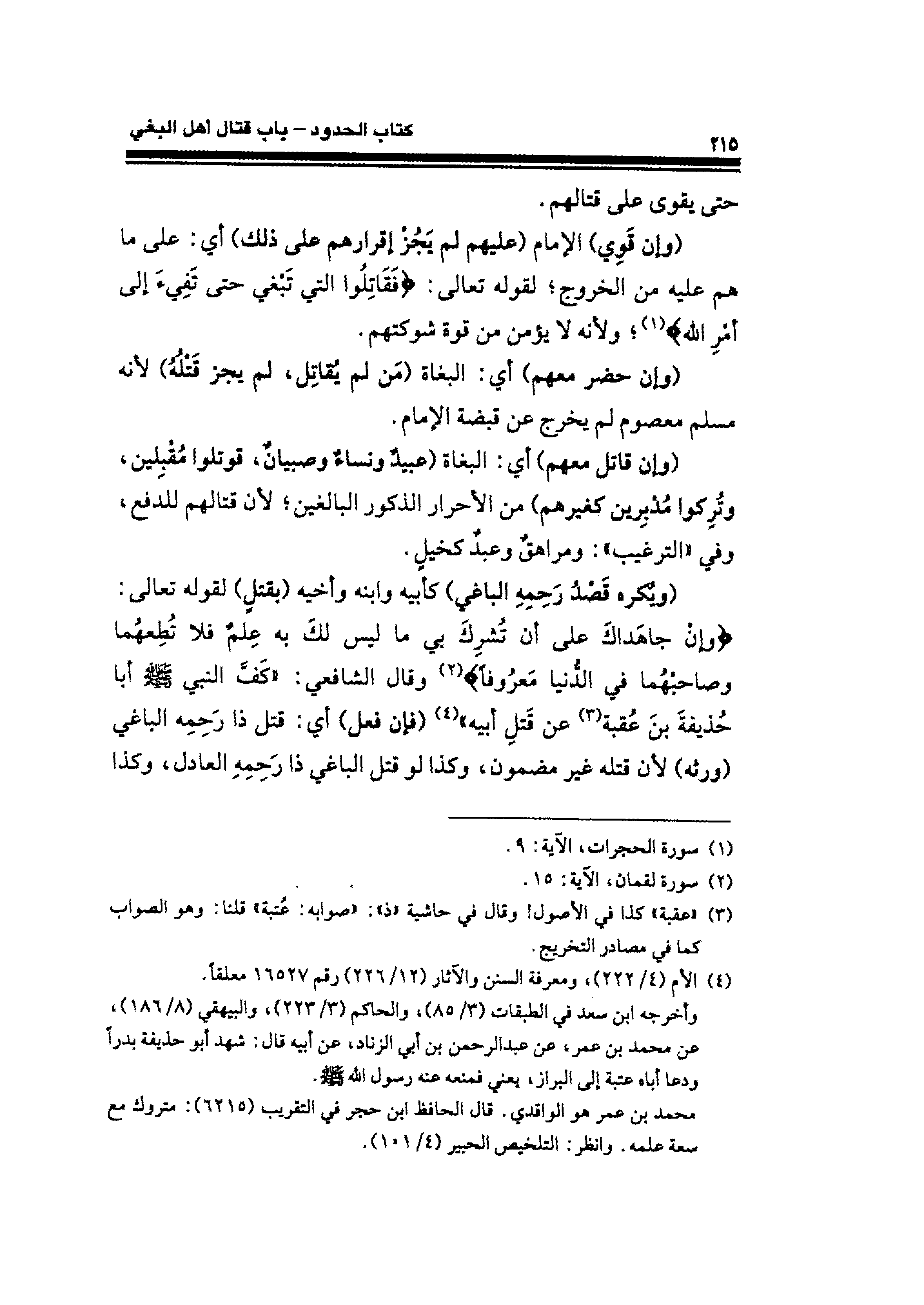 (ويُكره قَصْدُ رَحِمِهِ الباغي) كأبيه وابنه وأخيه (بقتلٍ) لقوله تعالى: {وَإِنْ جَاهَدَاكَ عَلَى أَنْ تُشْرِكَ بِي مَا لَيسَ لَكَ بِهِ عِلْمٌ فَلَا تُطِعْهُمَا وَصَاحِبْهُمَا فِي الدُّنْيَا مَعْرُوفًا} (¬٢) وقال الشافعي: "كَفَّ النبي - صلى الله عليه وسلم - أبا حُذيفةَ بنَ عُقبة (¬٣) عن قَتلِ أبيه" (¬٤) (فإن فعل) أي: قتل ذا رَحِمِه الباغي (ورثه) لأن قتله غير مضمون، وكذا لو قتل الباغي ذا رَحِمِهِ العادل، وكذا