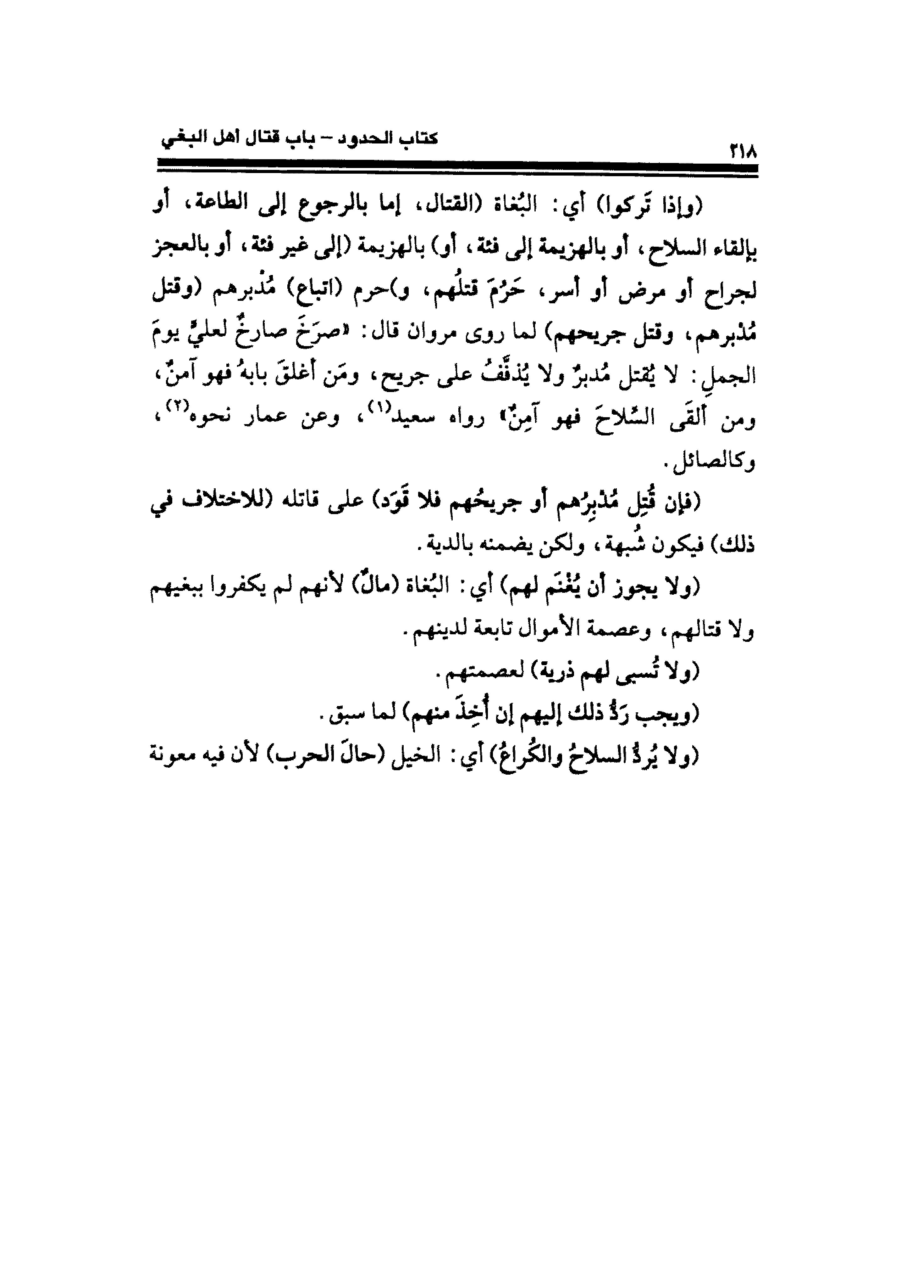 (وإذا تركوا) أي: البُغاة (القتال، إما بالرجوع إلى الطاعة، أو بإلقاء السلاح، أو بالهزيمة إلى فئة، أو) بالهزيمة (إلى غير فئة، أو بالعجز لجراح أو مرض أو أسر، حرم قتلُهم، و) حرم (اتباع) مُدبرهم (وقتل مُدبرهم، وقتل جرجهم) لما روى مروان قال: "صرَخَ صارخ لعليٍّ يومَ الجملِ: لا يقتل مدبرٌ ولا يُذفَّف على جريح، ومَن أغلقَ بابه فهو آمنٌ، ومن ألقَى السِّلاح فهو آمِنٌ" رواه سعيد (١)، وعن عمار نحوه (٢)، وكالصائل.