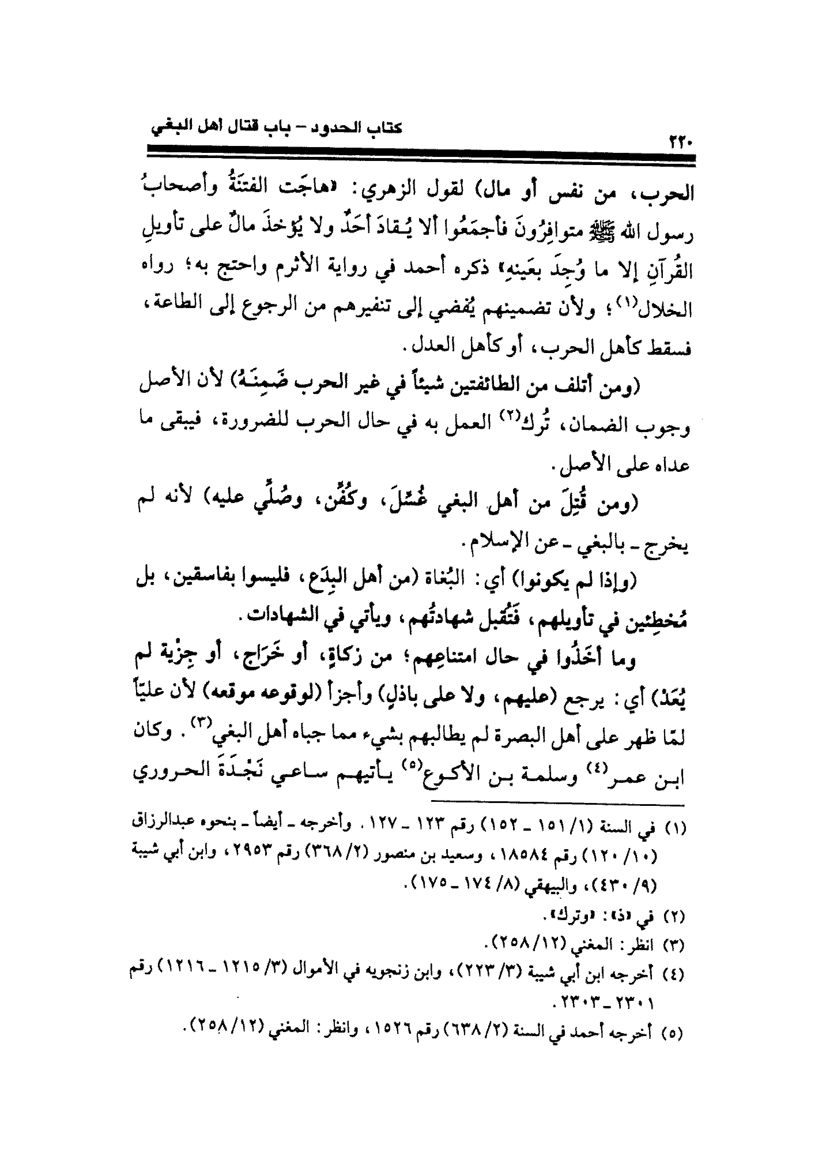 الحرب، من نفس أو مال) لقول الزهري: "هاجَت الفتنَةُ وأصحابُ رسول الله - صلى الله عليه وسلم - متوافِرُونَ فأجمَعُوا ألا يُقادَ أحَدٌ ولا يؤخذَ مال على تأويلِ القُرآنِ إلا ما وُجدَ بعَينهِ" ذكره أحمد في رواية الأثرم واحتج به؛ رواه الخلال (¬١)؛ ولأن تضمينهم يُفضي إلى تنفيرهم من الرجوع إلى الطاعة، فسقط كأهل الحرب، أو كأهل العدل.