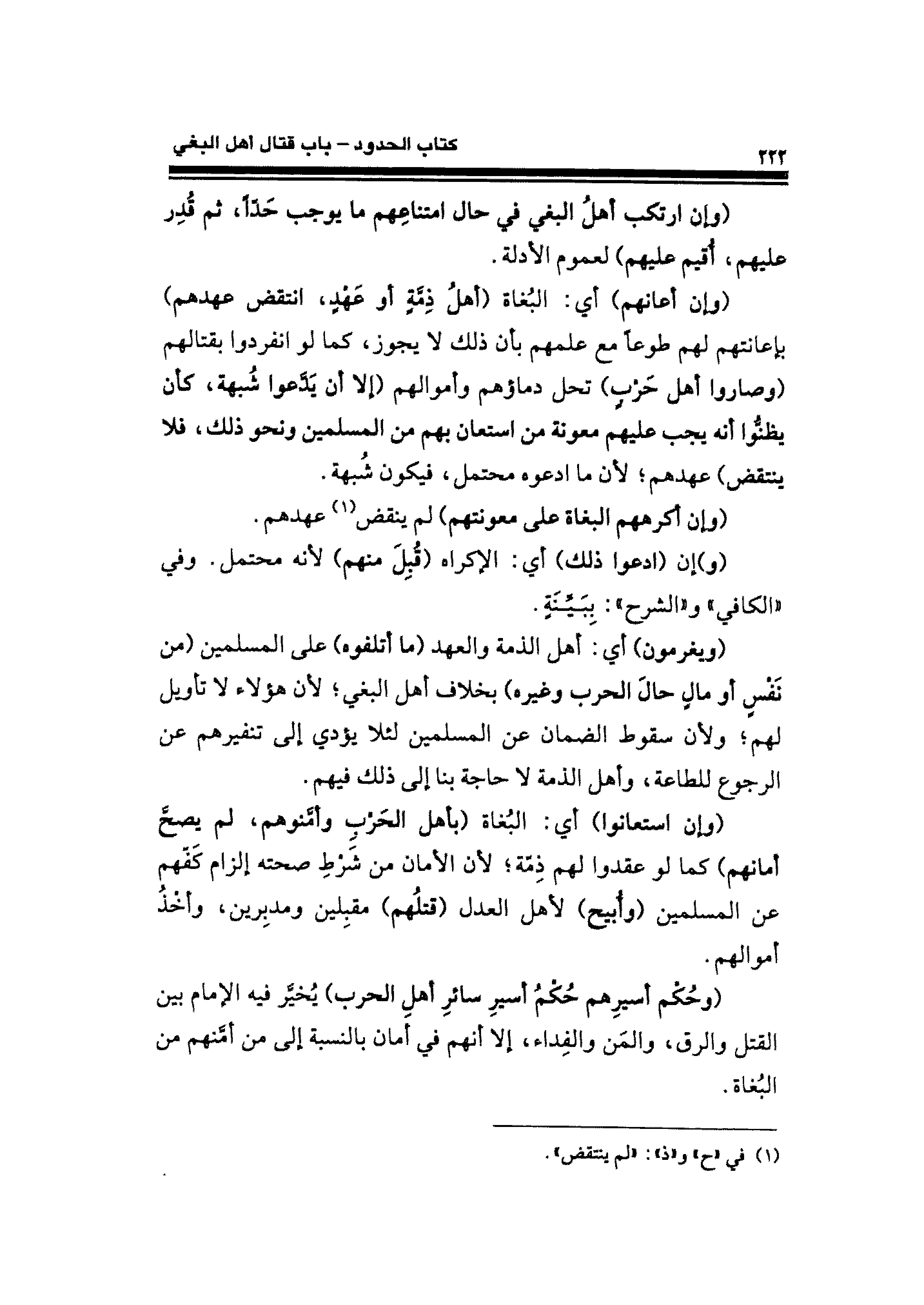 (وإن أعانهم) أي: البُغاة (أهل ذِمةٍ أو عهدٍ، انتقض عهدهم) بإعانتهم لهم طوعًا مع علمهم بأن ذلك لا يجوز، كما لو انفردوا بقتالهم (وصاروا أهل حَربٍ) تحل دماوهم وأموالهم (إلا أن يدعوا شُبهة، كأن يظنُّوا أنه يجب عليهم معونة من استعان بهم من المسلمين ونحو ذلك، فلا ينتقض) عهدهم؛ لأن ما ادعوه محتمل، فيكون شُبهة.