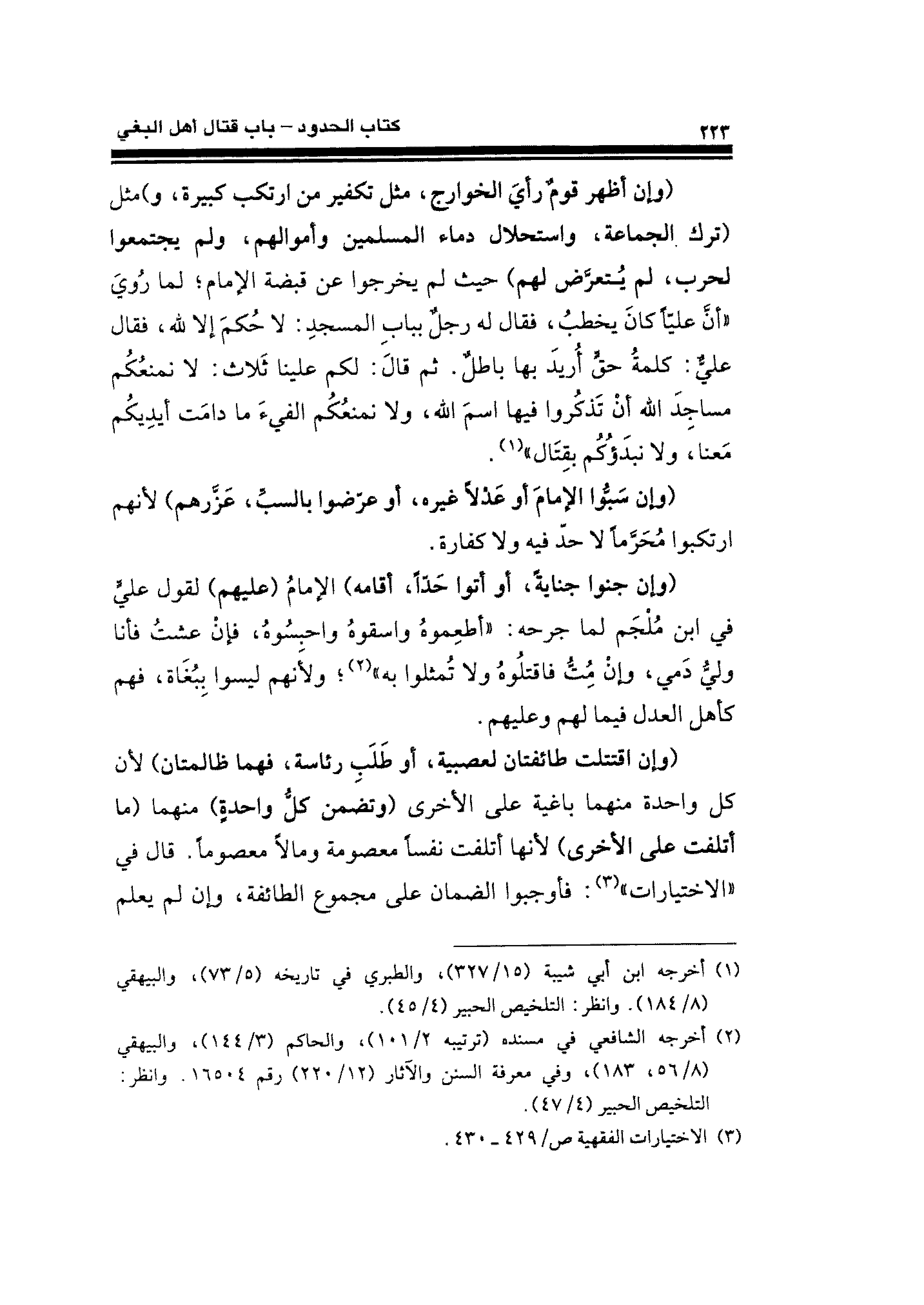 (وإن أظهر قومٌ رأي الخوارج، مثل تكفير من ارتكب كبيرة، و) مثل (ترك الجماعة، واستحلال دماء المسلمين وأموالهم، ولم يجتمعوا لحرب، لم يُتعرَّض لهم) حيث لم يخرجوا عن قبضة الإمام؛ لما رُويَ "أن عليًّا كانَ يخطبُ، فقال له رجلٌ ببابِ المسجدِ: لا حُكمَ إلا لله، فقال عليٌّ: كلمةُ حقٍّ أُريدَ بها باطل. ثم قال: لكم علينا ثَلاث: لا نمنعُكم مساجِدَ الله أنْ تَذكُروا فيها اسمَ الله، ولا نمنعُكم الفيءَ ما دامَت أيدِيكُم مَعنا، ولا نبدَؤُكُم بقِتَال" (¬١).