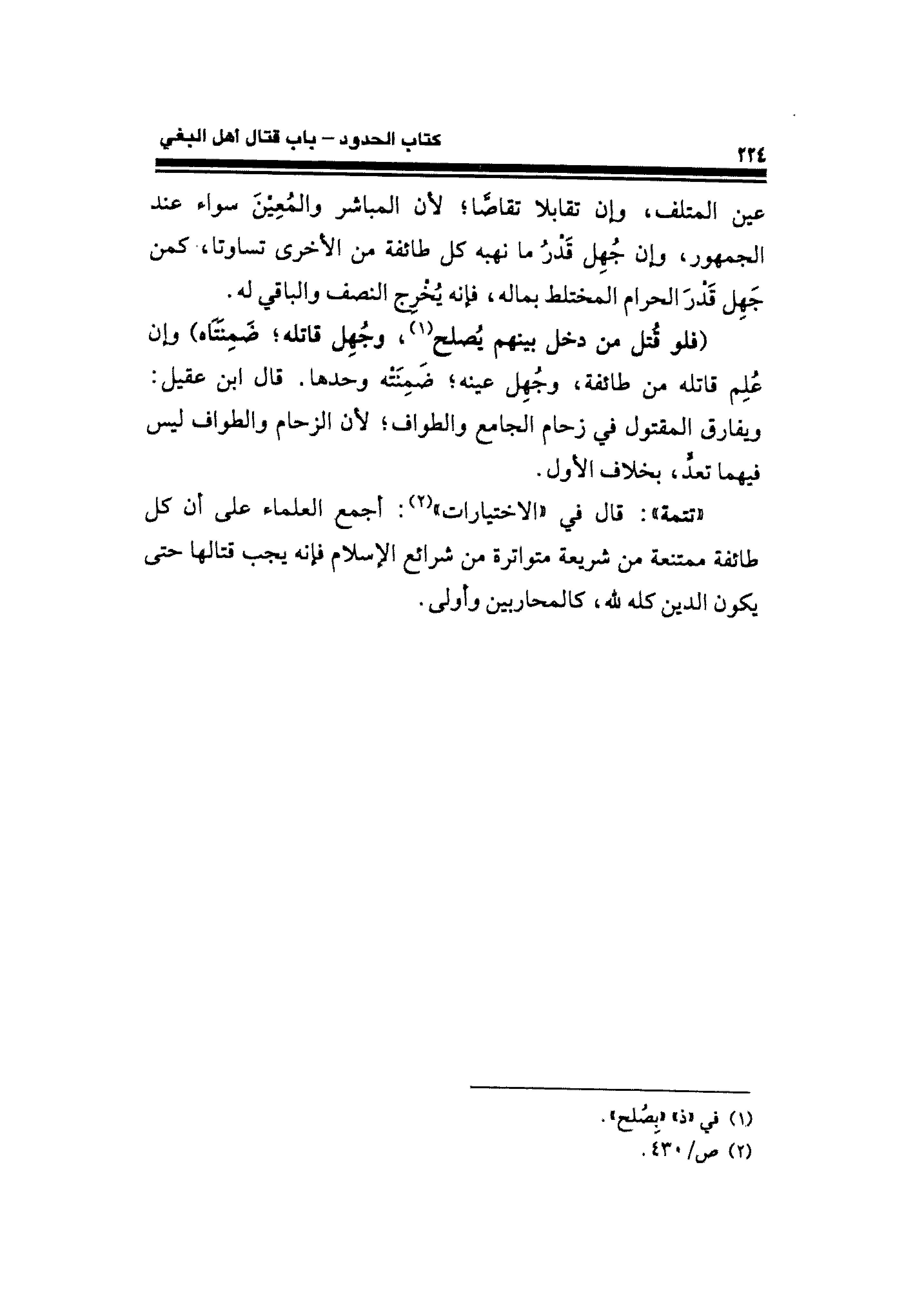 "تتمة": قال في "الاختيارات" (¬٢): أجمع العلماء على أن كل طائفة ممتنعة من شريعة متواترة من شرائع الإسلام فإنه يجب قتالها حتى يكون الدين كله لله، كالمحاربين وأولى.