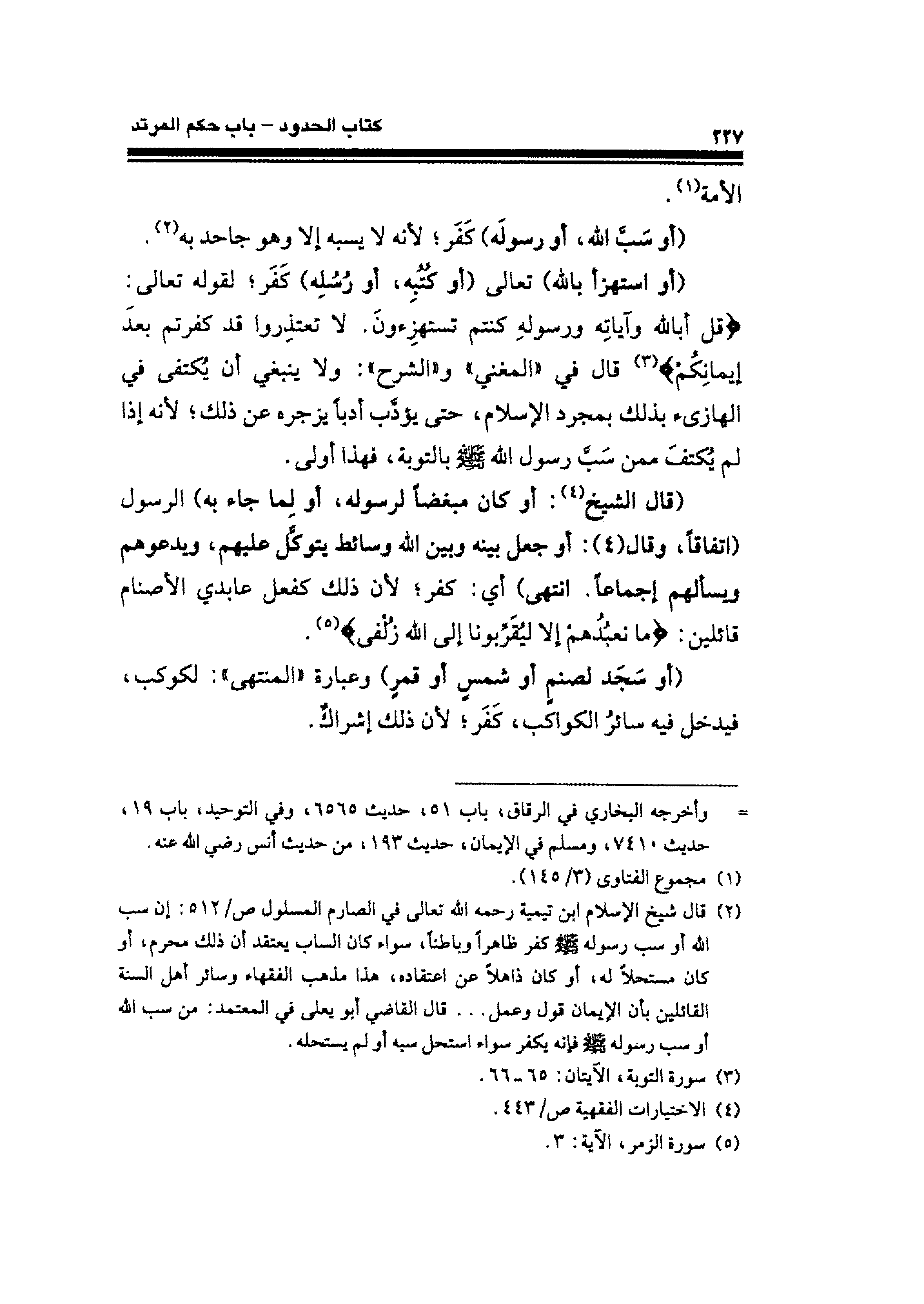 (¬٢) قال شيخ الإسلام ابن تيمية رحمه الله تعالى في الصارم المسلول ص / ٥١٢: إن من سب الله أو سب رسوله - صلى الله عليه وسلم - كفر ظاهرًا وباطنًا، سواء كان الساب يعتقد أن ذلك محرم، أو كان مستحلًّا له، أو كان ذاهلًا عن اعتقاده، هذا مذهب الفقهاء وسائر أهل السنة القائلين بأن الإيمان قول وعمل ... قال القاضي أبو يعلى في المعتمد: من سب الله أو سب رسوله - صلى الله عليه وسلم - فإنه يكفر سواء استحل سبه أو لم يستحله.
