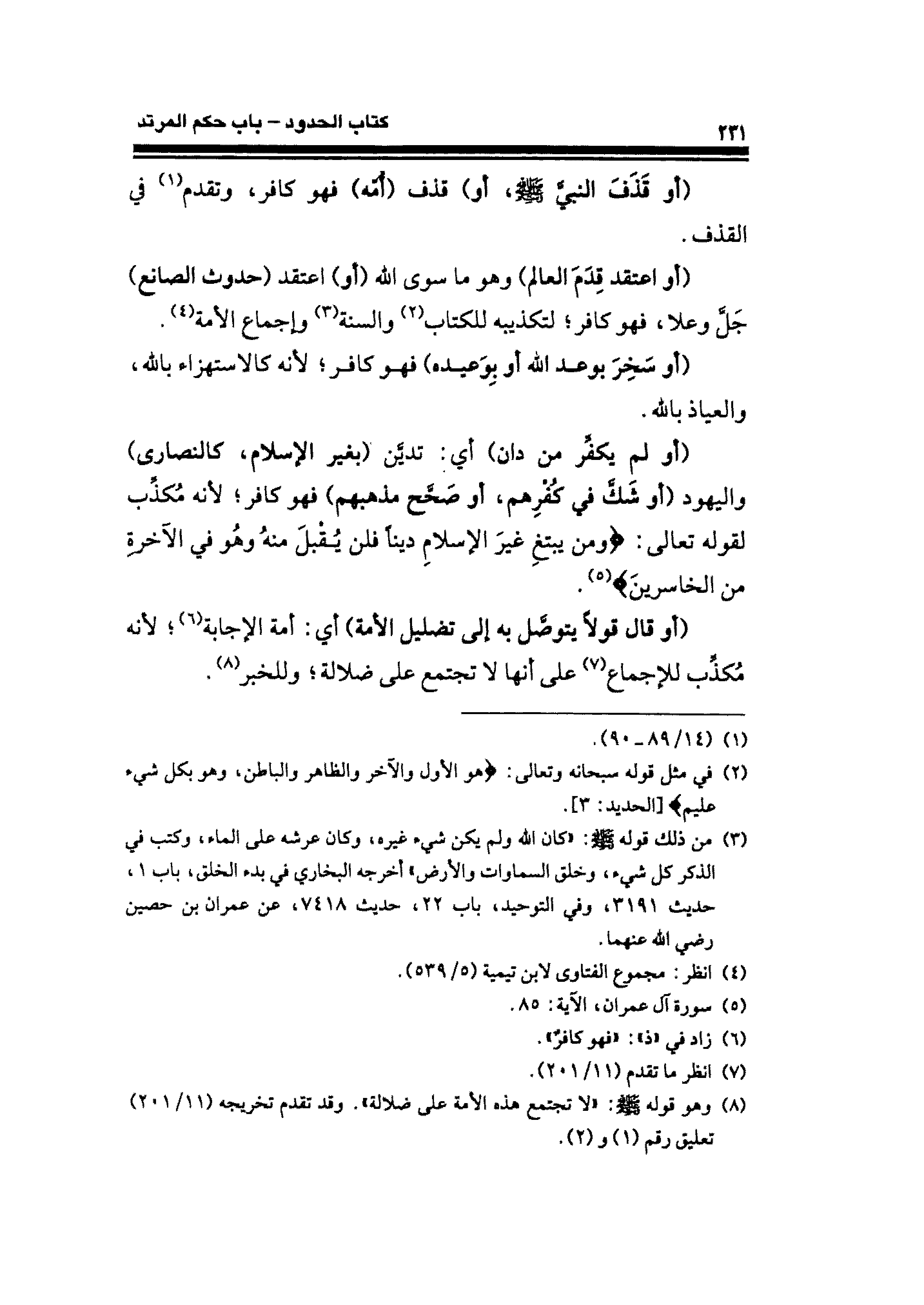(أو اعتقد قِدَمَ العالم) وهو ما سوى الله (أو) اعتقد (حدوث الصانع) جَلَّ وعلا، فهر كافر؛ لتكذيبه للكتاب (¬٢) والسنة (¬٣) وإجماع الأمة (¬٤).