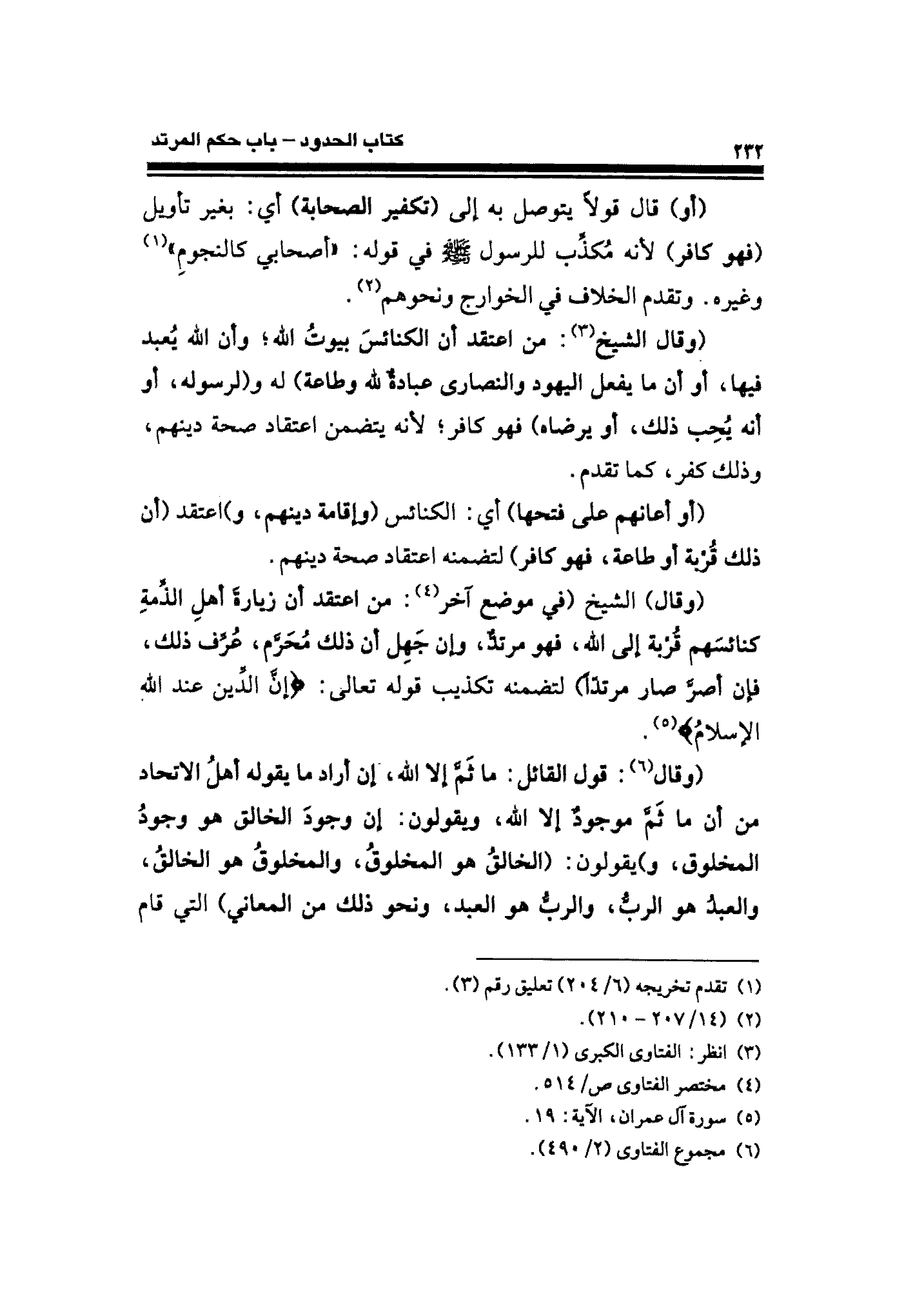 (وقال) الشيخ (في موضع آخر (¬٤): من اعتقد أن زيارةَ أهلِ الذِّمةِ كنائسَهم قُرْبة إلى الله، فهو مرتدٌّ، وإن جَهِل أن ذلك مُحَرَّم، عُرِّف ذلك، فإن أصرَّ صار مرتدًا) لتضمنه تكذيب قوله تعالى: {إِنَّ الدِّينَ عِنْدَ اللَّهِ الْإِسْلَامُ} (¬٥).