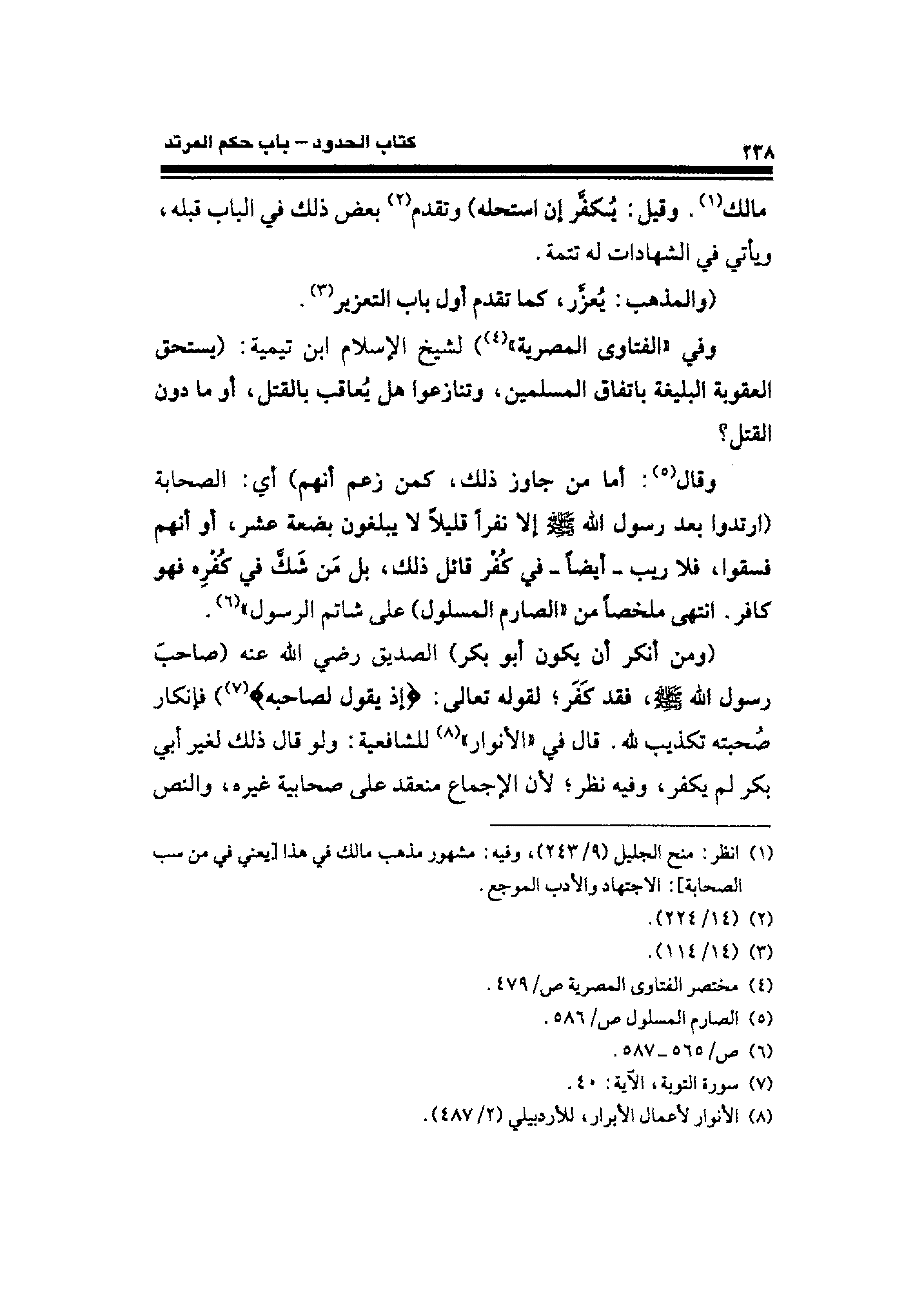 (¬١) انظر: منح الجليل (٩/ ٢٤٣)، وفيه: مشهور مذهب مالك في هذا [يعني في من سب الصحابة]: الاجتهاد والأدب الموجع.