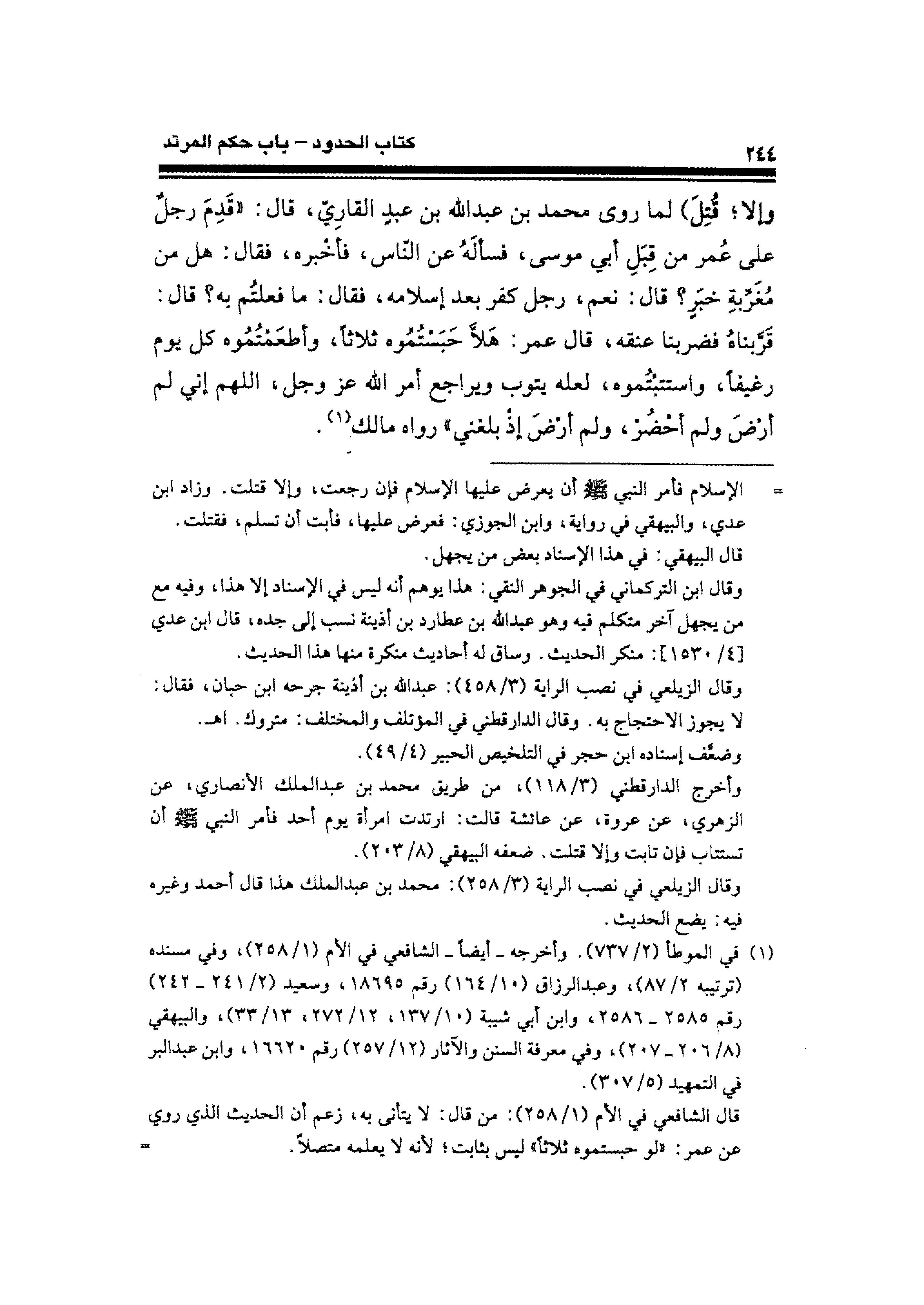 (وإلا؛ قُتِلَ) لما روى محمد بن عبد الله بن عبد القارِي، قال: "قَدِمَ رجلٌ على عُمر من قِبَلِ أبي موسى، فسألَهُ عن النَّاس، فأخْبره، فقال: هل من مُغَرِّبةِ خبَرٍ؟ قال: نعم، رجل كفر بعد إسلامه، فقال: ما فعلتُم به؟ قال: قَرَّبناهُ فضربنا عنقه، قال عمر: هَلَّا حَبَسْتُمُوه ثلاثًا، وأطعَمْتُمُوه كل يوم رغيفًا، واستتبْتُموه، لعله يتوب وبراجع أمر الله عزَّ وجلَّ، اللهم إني لم أرْضَ ولم أخْضُرْ، ولم أرْضَ إذْ بلغني" رواه مالك (¬١).