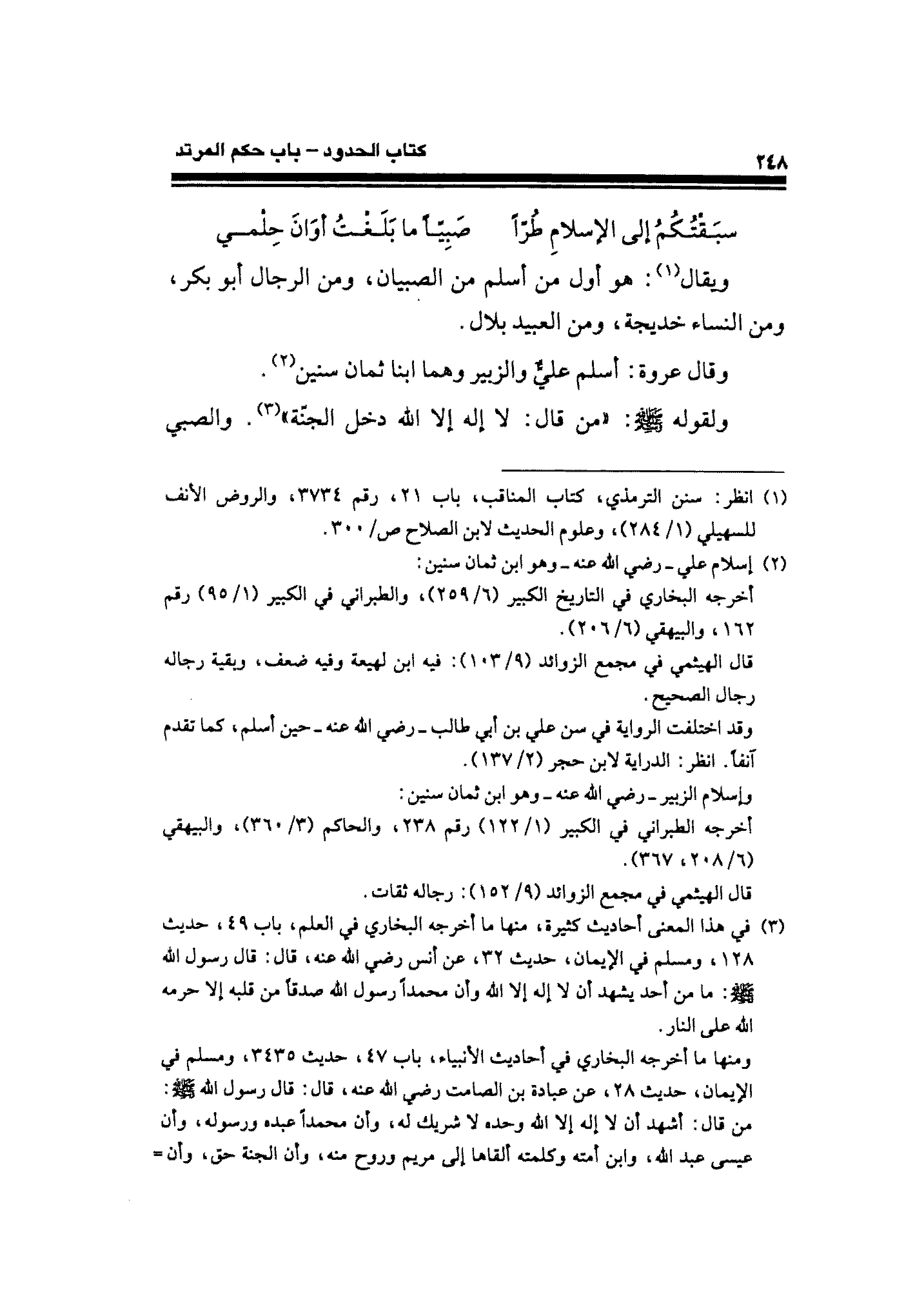 وقد اختلفت الرواية في سن علي بن أبي طالب - رضي الله عنه - حين أسلم، كما تقدم آنفًا. انظر: الدراية لابن حجر (٢/ ١٣٧).