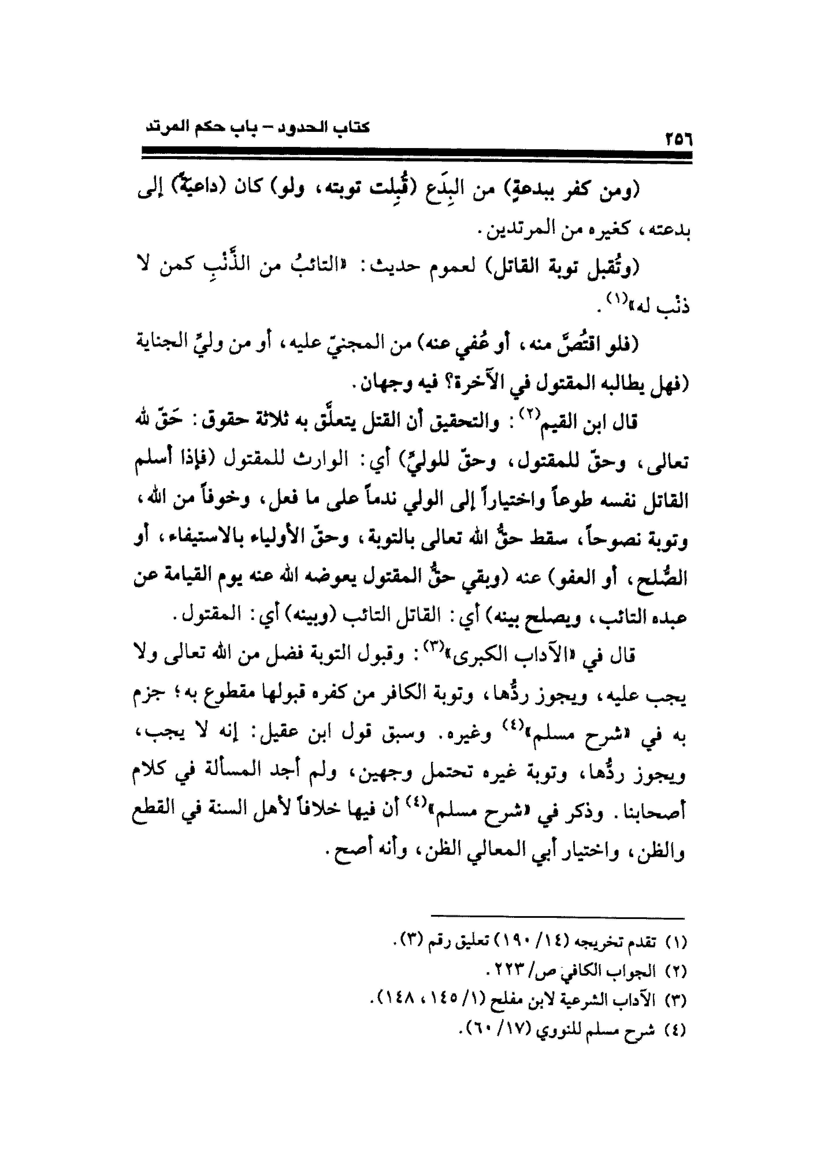 قال ابن القيم (¬٢): والتحقيق أن القتل يتعلَّق به ثلاثة حقوق: حَقّ لله تعالى، وحقّ للمقتول، وحق للوليِّ) أي: الوارث للمقتول (فإذا أسلم القاتل نفسه طوعًا واختيارًا إلى الولي ندمًا على ما فعل، وخوفًا من الله، وتوبة نصوحًا، سقط حقُّ الله تعالى بالتوبة وحقّ الأولياء بالاستيفاء، أو الصُّلح، أو العفو) عنه (وبقي حقُّ المقتول يعوضه الله عنه يوم القيامة عن عبده التائب، ويصلح بينه) أي: القاتل التائب (وبينه) أي: المقتول.