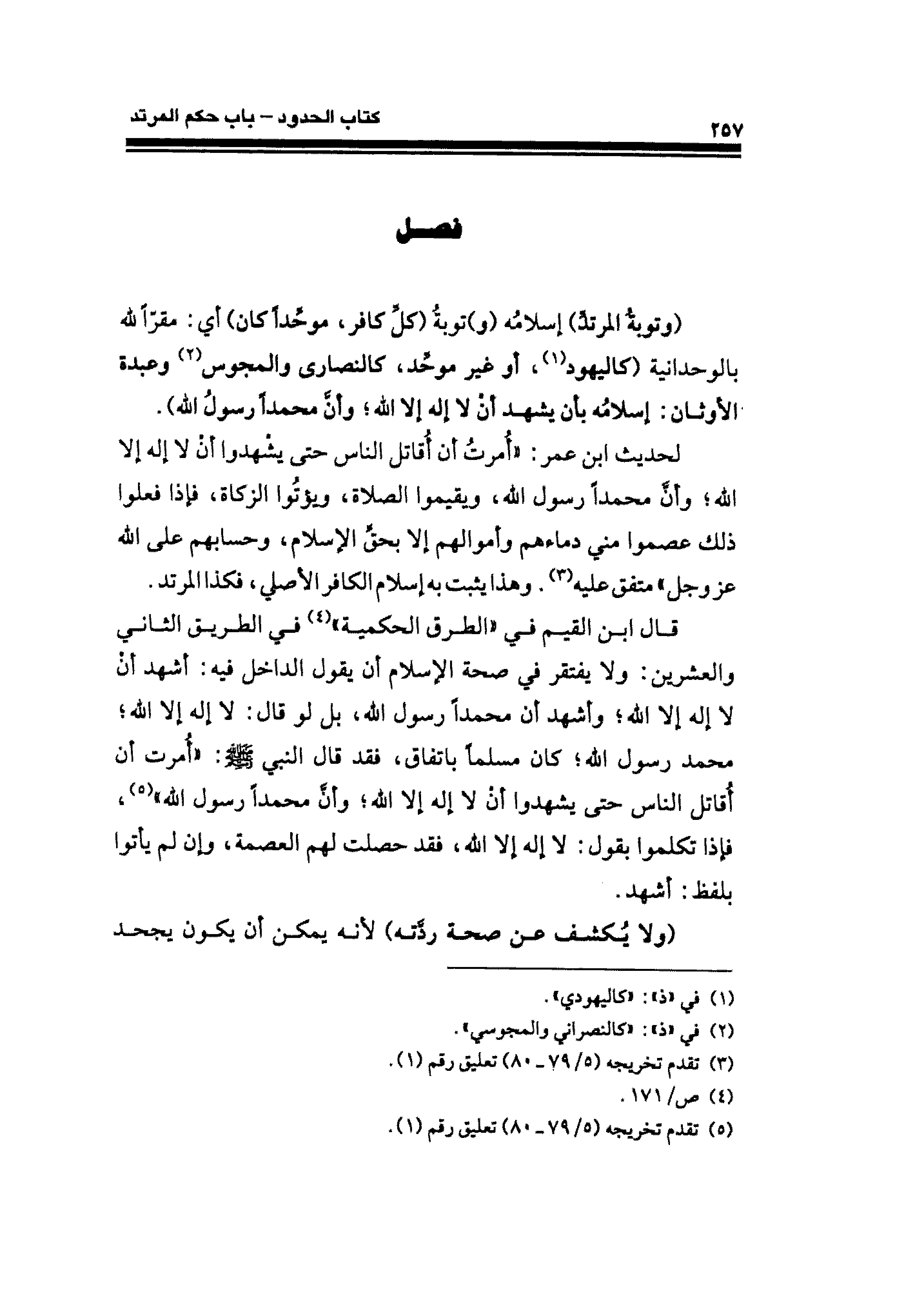 قال ابن القيم في "الطرق الحكمية" (¬٤) في الطريق الثاني والعشرين: ولا يفتقر في صحة الإِسلام أن يقول الداخل فيه: أشهد أنْ لا إله إلَّا الله؛ وأشهد أن محمدًا رسول الله، بل لو قال؛ لا إله إلَّا الله؛ مُحَمَّد رسول الله؛ كان مسلمًا بإتفاق، فقد قال النَّبِيّ - صلى الله عليه وسلم -: "أُمرت أن أقاتل النَّاس حتَّى يشهدوا أنْ لا إله إلا الله؛ وأن محمدًا رسول الله" (¬٥)، فإذا تكلموا بقول: لا إله إلا الله، فقد حصلت لهم العصمة، وإن لم يأتوا بلفظ: أشهد.