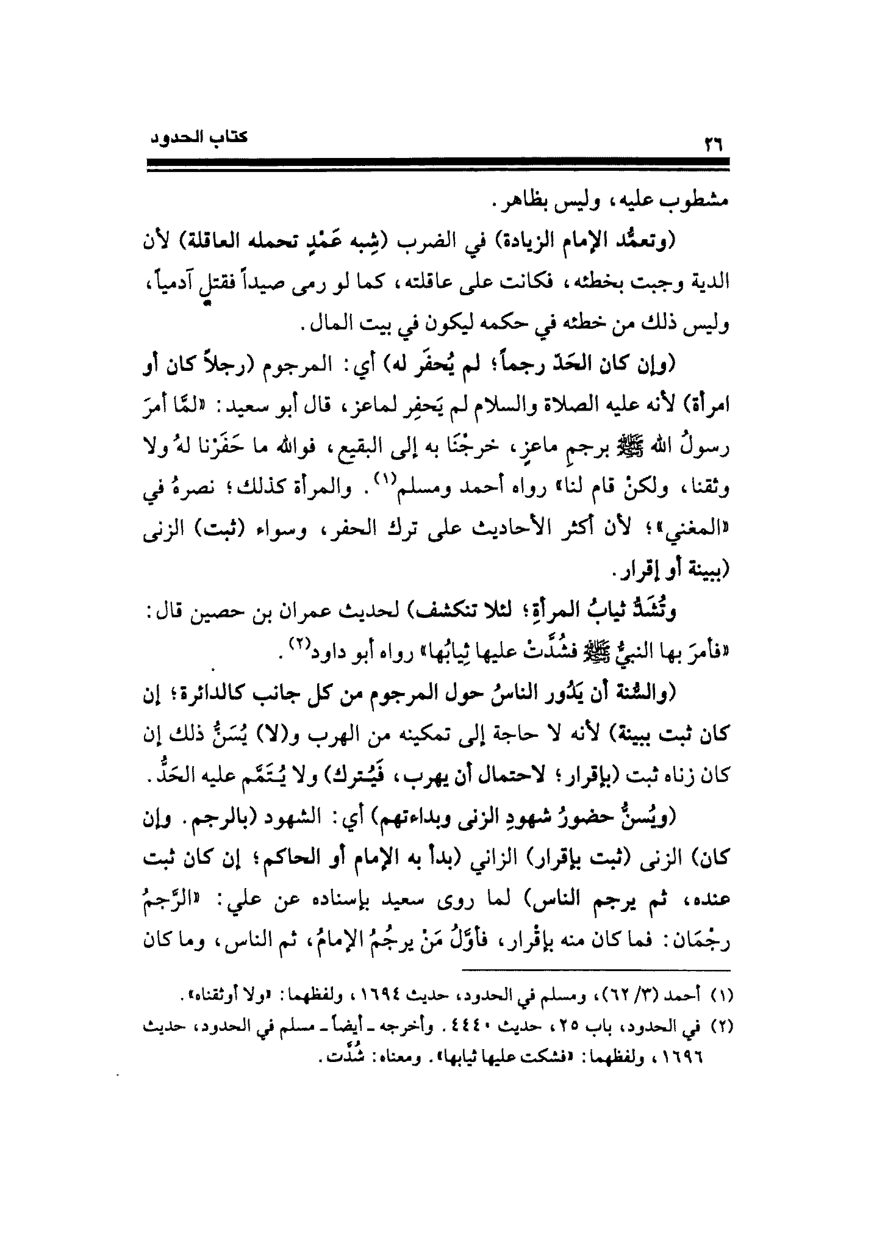 (وإن كان الحَدَ رجمًا؛ لم يُحفَر له) أي: المرجوم (رجلًا كان أو امرأة) لأنه عليه الصلاة والسلام لم يَحفِر لماعز، قال أبو سعيد: "لمَّا أمرَ رسولُ الله - صلى الله عليه وسلم - برجمِ ماعزٍ، خرجْنَا به إلى البقيع، فوالله ما حَفَرْنا له ولا وَثَّقْنَا، ولكنَ قام لنَا" رواه أحمد ومسلم" (¬١). والمرأة كذلك؛ نصرهُ في "المغني"؛ لأن أكثر الأحاديث على ترك الحفر، وسواء (ثبت) الزنى (ببينة أو إقرار.