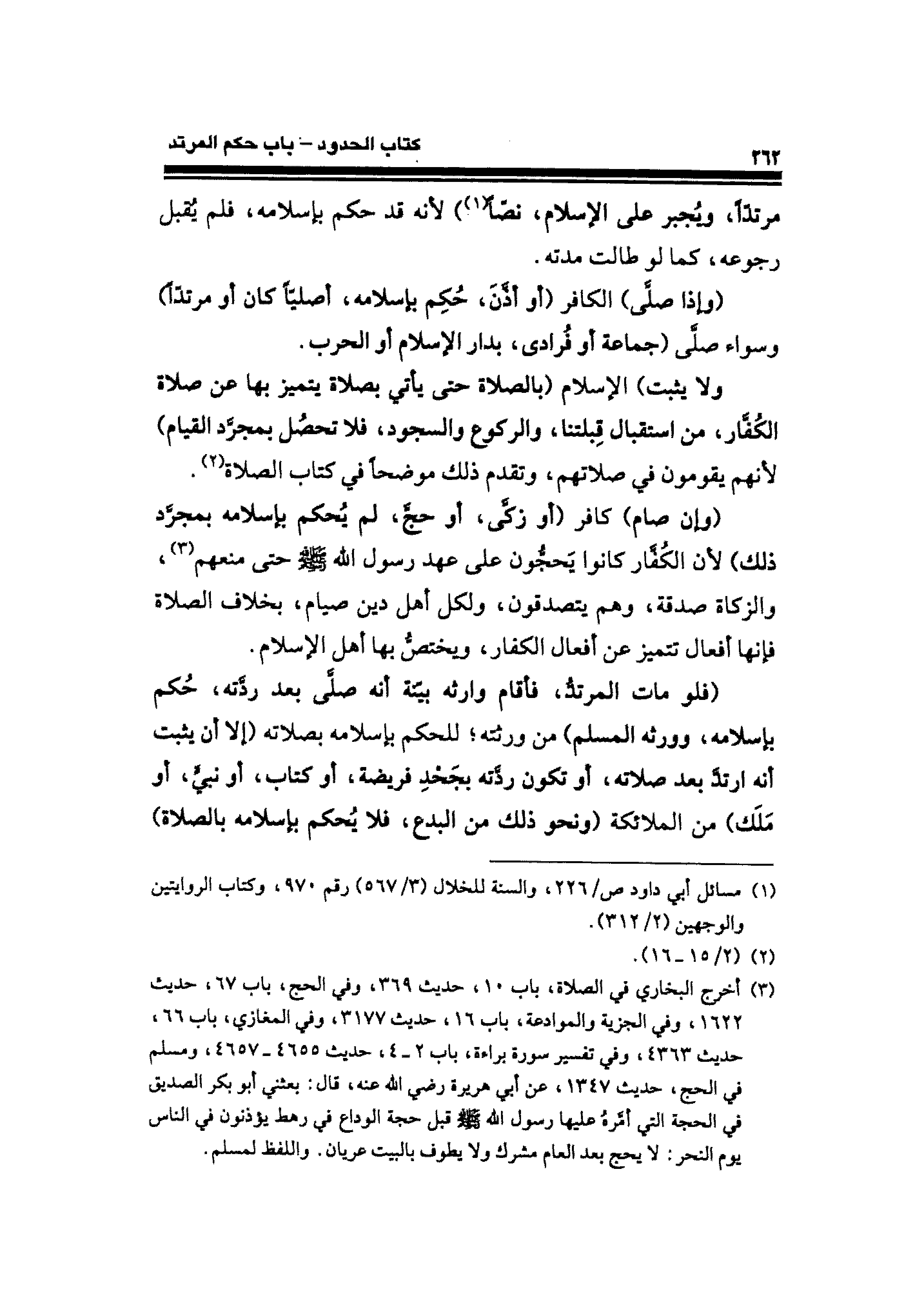 (فلو مات المرتدُّ، فأقام وارثه بيّنة أنه صلَّى بعد ردَّته، حُكم بإسلامه، وورثه المسلم) من ورثته؛ للحكم بإسلامه بصلاته (إلا أن يثبت أنه ارتدَّ بعد صلاته، أو تكون ردَّته بجَحْدِ فريضة، أو كتاب، أو نبيٍّ، أو مَلَك) من الملائكة (ونحو ذلك من البدع، فلا يُحكم بإسلامه بالصلاة)
