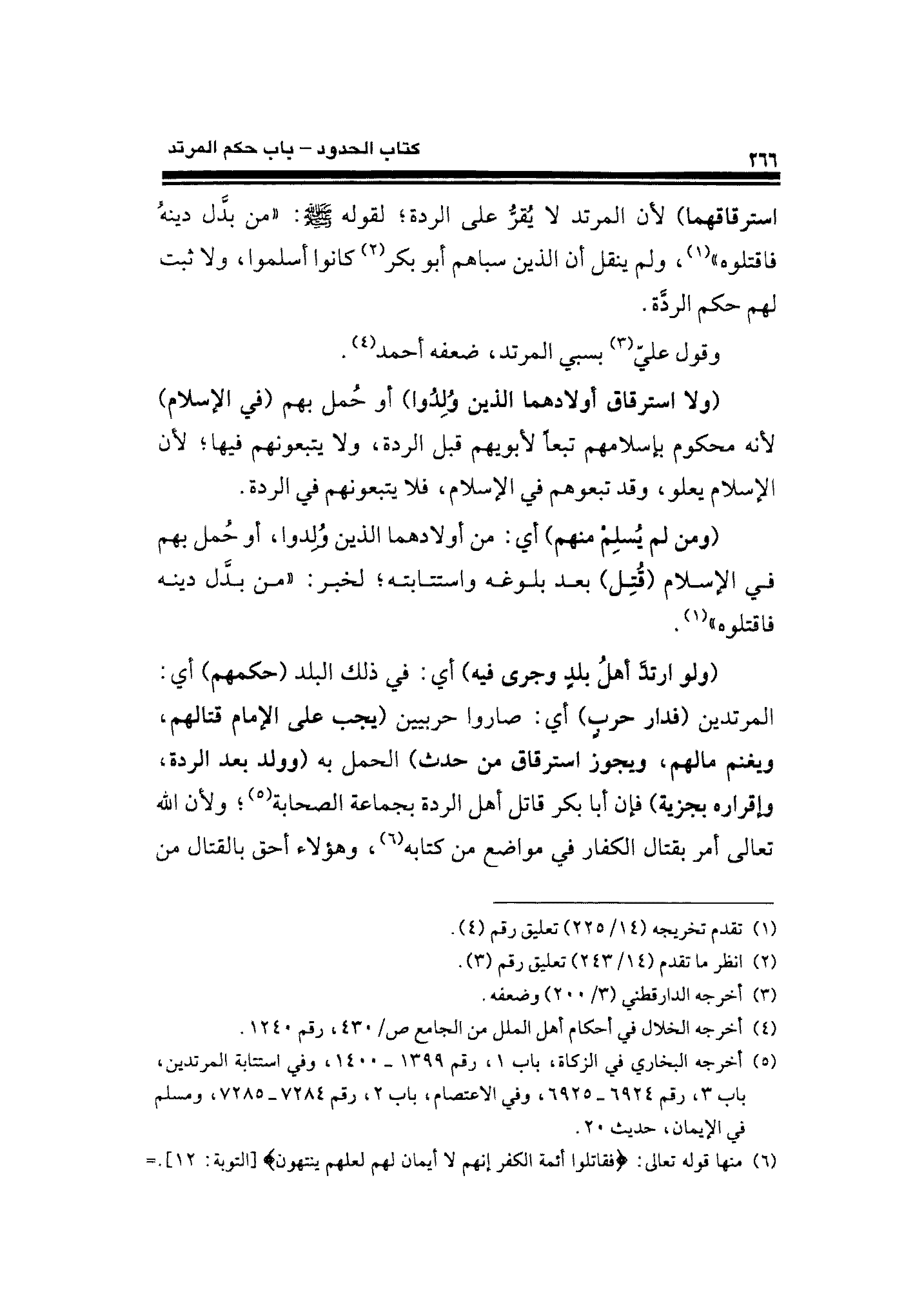 استرقاقهما) لأن المرتد لا يُقرُّ على الردة؛ لقوله - صلى الله عليه وسلم -: "من بدَّل دينهُ فاقتلوه" (¬١)، ولم ينقل أن الذين سباهم أبو بكر (¬٢) كانوا أسلموا، ولا ثبت لهم حكم الردَّة.