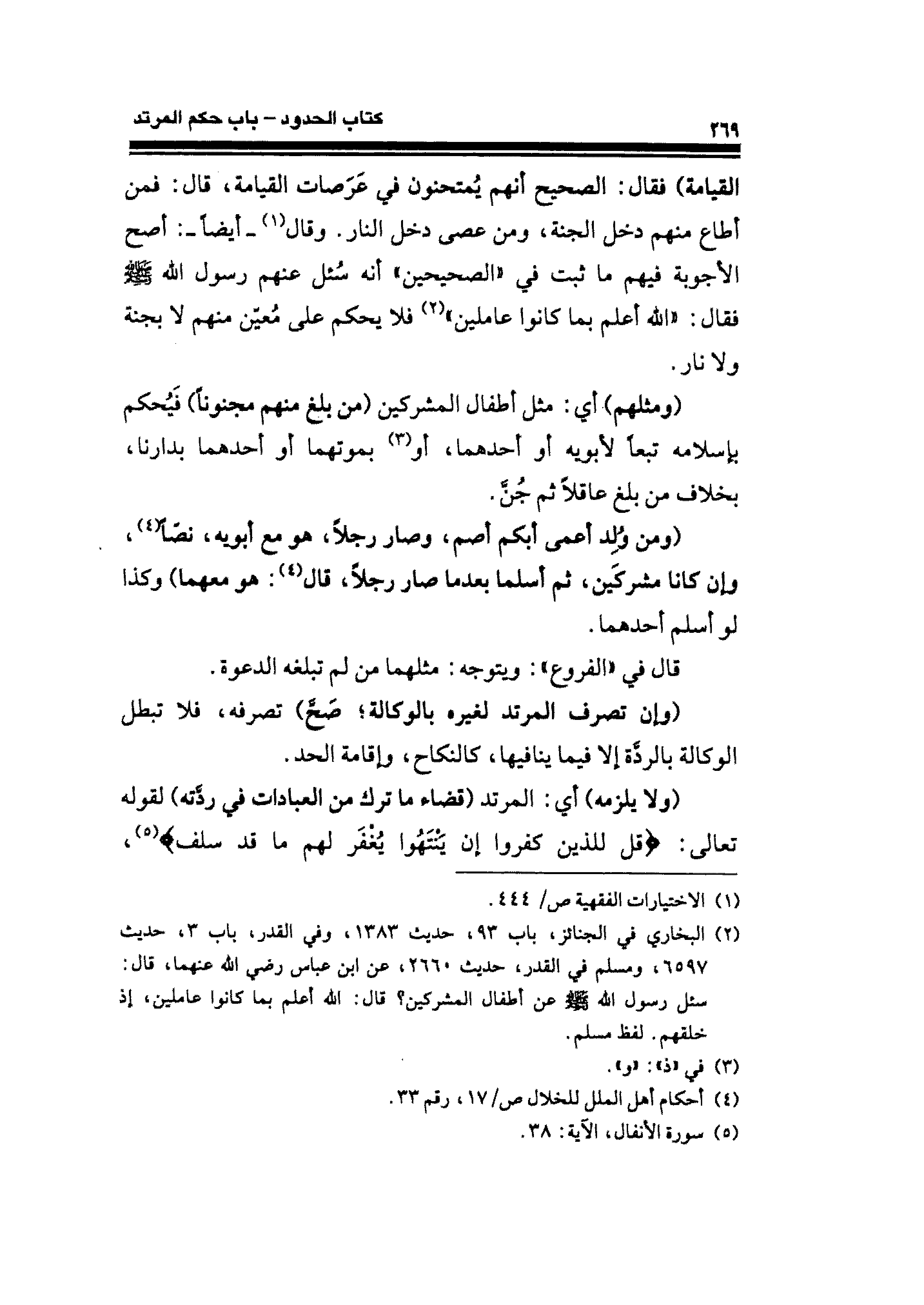 (¬٢) البخاري في الجنائز، باب ٩٣، حديث ١٣٨٣، وفي القدر، باب ٣، حديث ٦٥٩٧، ومسلم في القدر، حديث ٢٦٦٠، عن ابن عباس رضي الله عنهما، قال: سئل رسول الله - صلى الله عليه وسلم - عن أطفال المشركين؟ قال: الله أعلم بما كانوا عاملين، إذ خلقهم. لفظ مسلم.