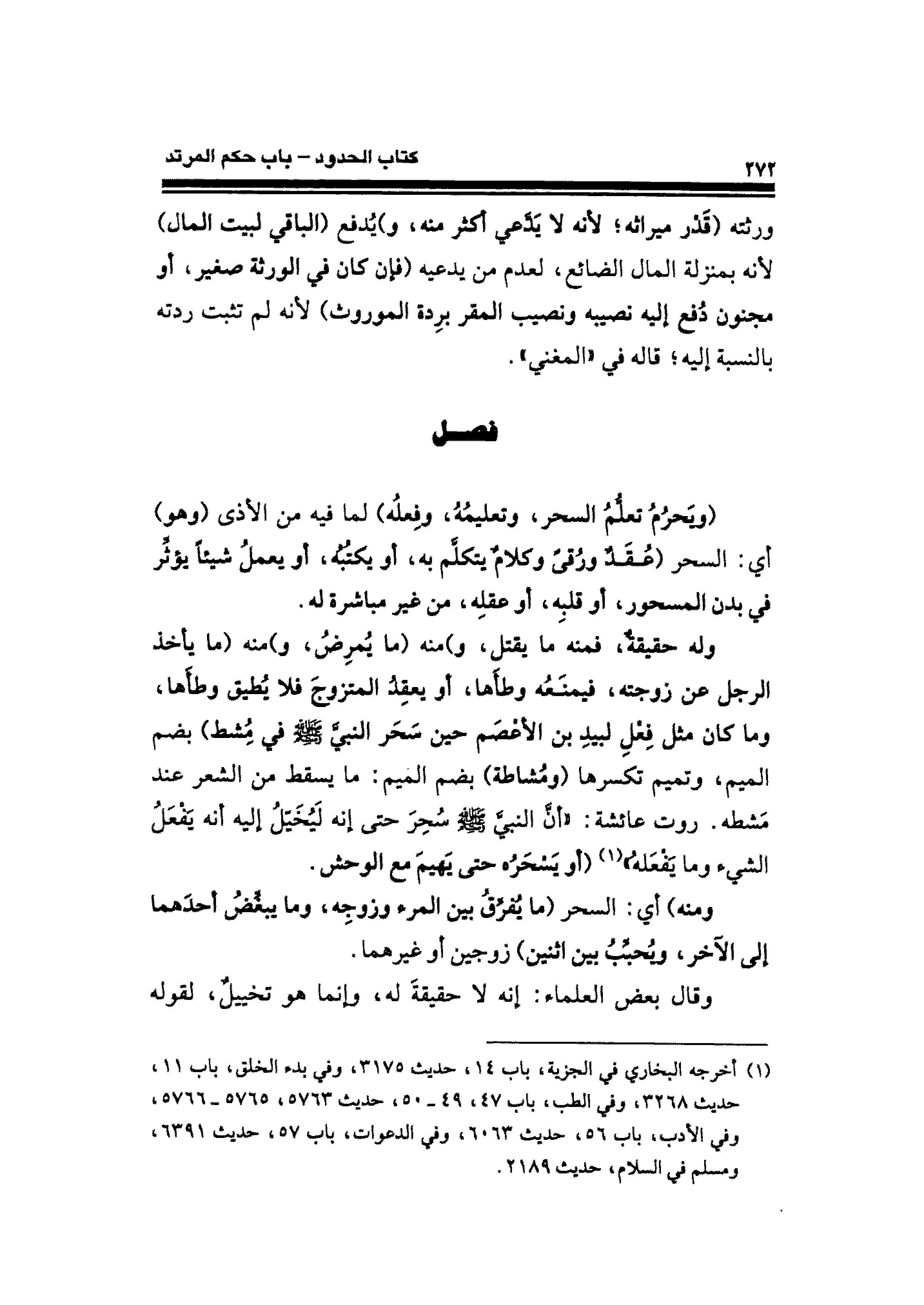 وله حقيقةٌ، فمنه ما يقتل، و) منه (ما يُمرِضُ، و) منه (ما يأخذ الرجل عن زوجته، فيمنَعُه وطأها، أو يعقِدُ المتزوجَ فلا يُطبق وطأَها، وما كان مثل فِعْلِ لبيدِ بن الأعْصَم حين سَحَر النبيَّ - صلى الله عليه وسلم - في مُشِط) بضم الميم، وتميم تكسرها (ومُشاطة) بضم الميم: ما يسقط من الشعر عند مَشطه. روت عائشة: "أنَّ النبيَّ - صلى الله عليه وسلم - سُحِرَ حتى إنه لَيُخَيّلُ إليه أنه يَفْعَلُ الشيء وما يَفْعَله" (¬١) (أو يَسْحَرُه حتى يَهيمَ مع الوحش.