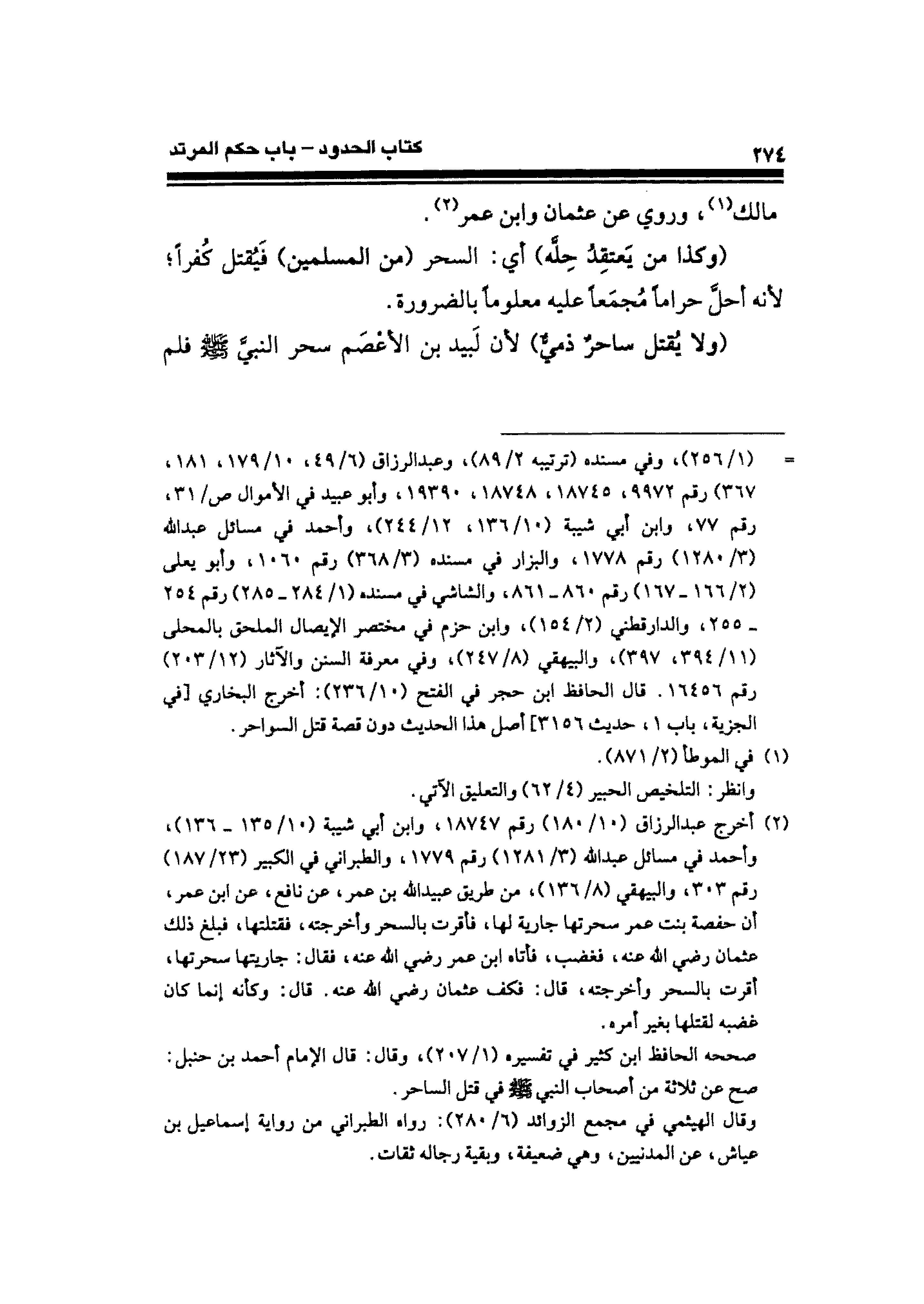 (¬٢) أخرج عبد الرزاق (١٠/ ١٨٠) رقم ١٨٧٤٧، وابن أبي شيبة، (١٠/ ١٣٥ - ١٣٦)، وأحمد في مسائل عبد الله (٣/ ١٢٨١) رقم ١٧٧٩، والطبراني في الكبير (٢٣/ ١٨٧) رقم ٣٠٣، والبيهقي (٨/ ١٣٦)، من طريق عبيد الله بن عمر، عن نافع، عن ابن عمر، أن حفصة بنت عمر سحرتها جارية لها، فأقرت بالسحر وأخرجته، فقتلتها، فبلغ ذلك عثمان رضي الله عنه، فغضب، فأتاه ابن عمر رضي الله عنه، فقال: جاريها سحرتها، أقرت بالسحر وأخرجته، قال: فكف عثمان رضي الله عنه. قال: وكأنه إنما كان غضبه لقتلها بغير أمره.