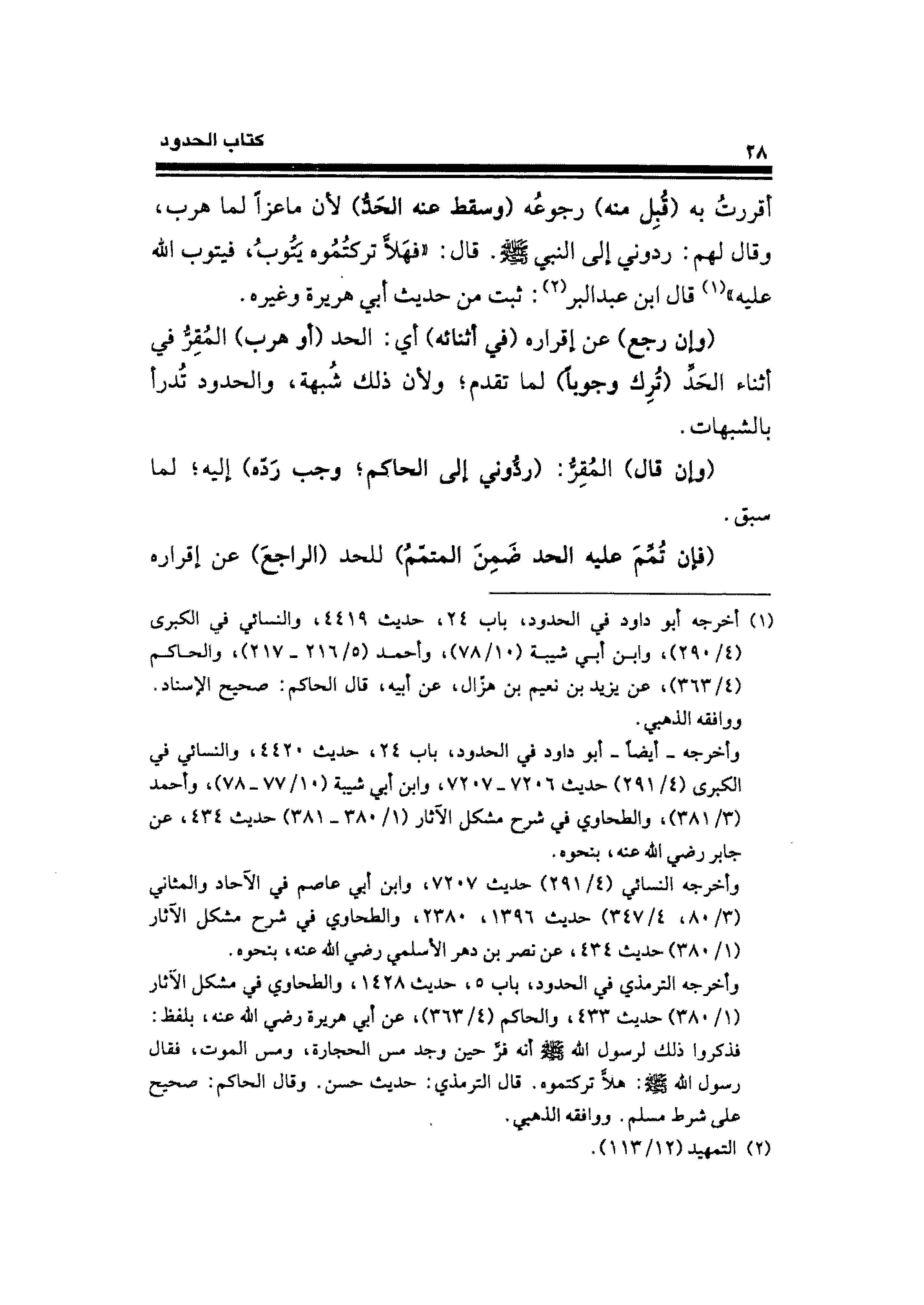أقررتُ به (قُبِل منه) رجوعُه (وسقط عنه الحَدُّ) لأن ماعزًا لما هرب، وقال لهم: ردوني إلى النبي - صلى الله عليه وسلم -. قال: "فَهَلَّا تركتُمُوه يَتُوبُ، فيتوب الله عليه" (¬١) قال ابن عبد البر (¬٢): ثبت من حديث أبي هريرة وغيره.