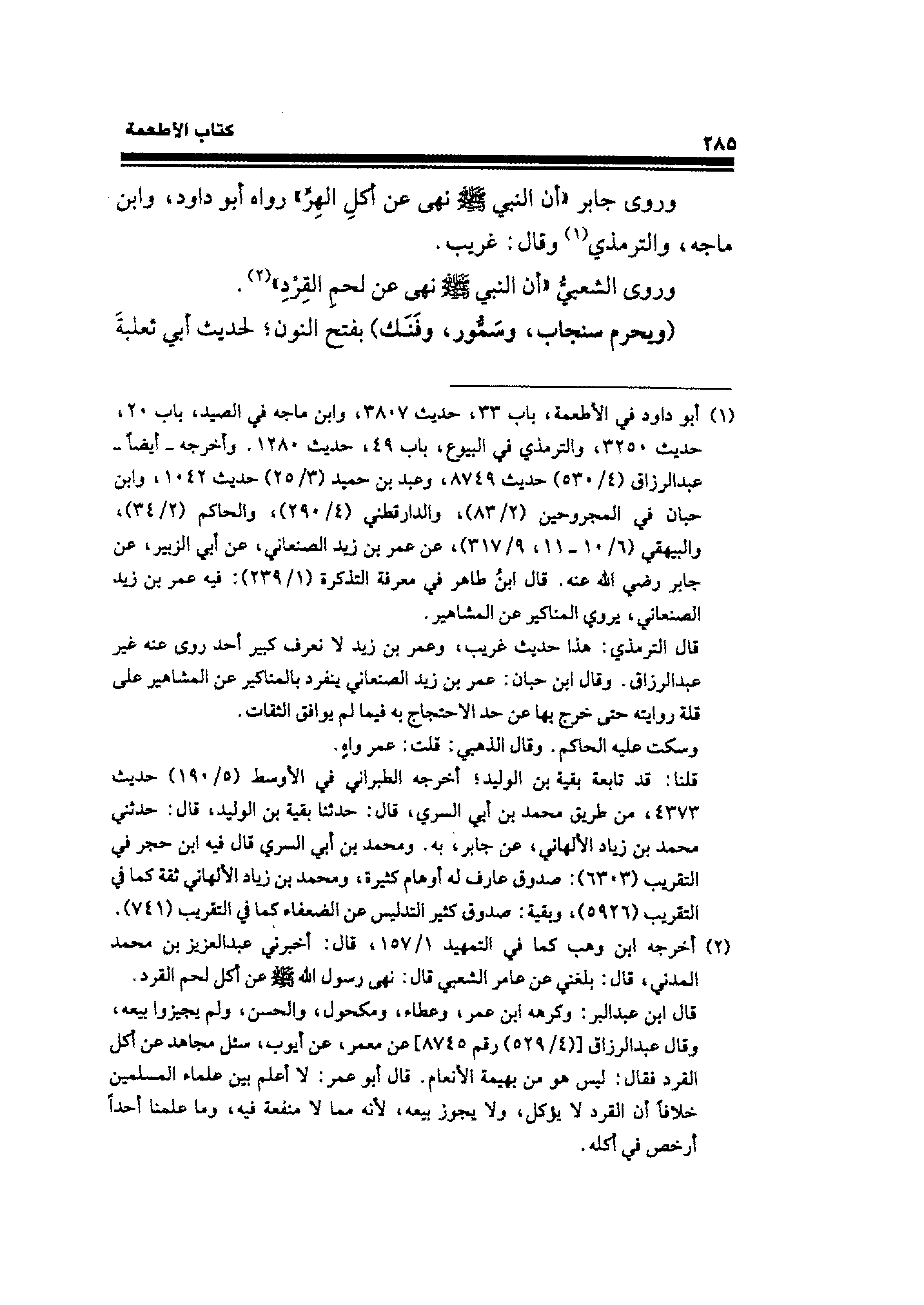 (¬١) أبو داود في الأطعمة، باب ٣٣ حديث ٣٨٠٧، وابن ماجه في الصيد" باب ٢٠، حديث ٣٢٥٠، والترمذي في البيوع، باب ٤٩، حديث ١٢٨٠. وأخرجه -أيضًا- عبد الرزاق (٤/ ٥٣٠) حديث ٨٧٤٩، وعبد بن حميد (٣/ ٢٥) حديث ١٠٤٢، وابن حبان في المجروحين (٢/ ٨٣)، والدارقطني (٤/ ٢٩٠)، والحاكم (٢/ ٣٤)، والبيهقي (٦/ ١٠ - ١١، ٩/ ٣١٧)، عن عمر بن زيد الصنعاني، عن أبي الزبير، عن جابر رض الله عنه. قال ابنُ طاهر في معرفة التذكرة (١/ ٢٣٩): فيه عمر بن زيد الصنعاني، يروي المناكير عن المشاهير.
