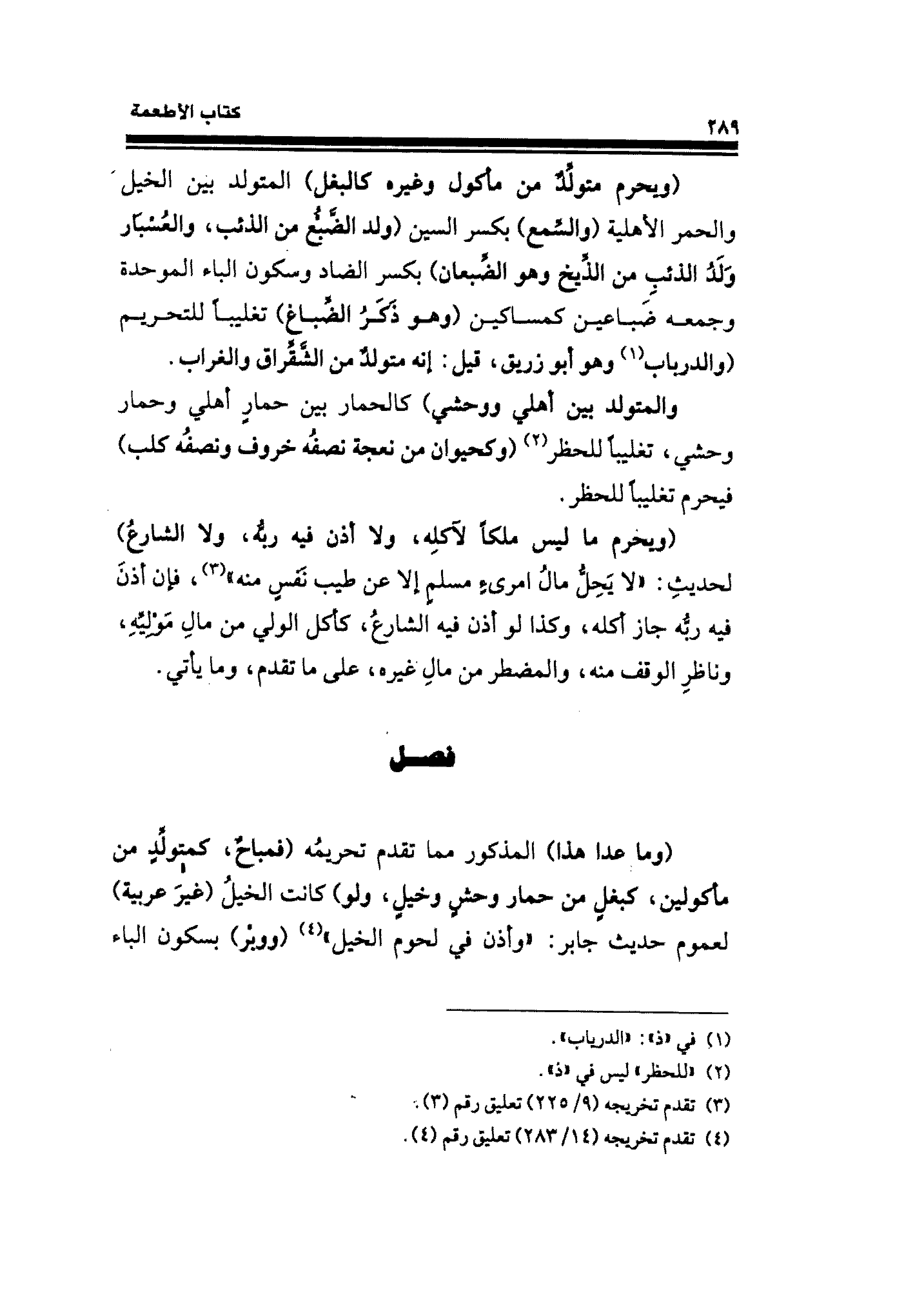 والمتولد بين أهلي ووحشي) كالحمار بين حمارٍ أهلي وحمار وحشي، تغليبًا للحظر (¬٢) (وكحيوان من نعجة نصفُة خروف ونصفُه كلب) فيحرم تغليبًا للحظر.