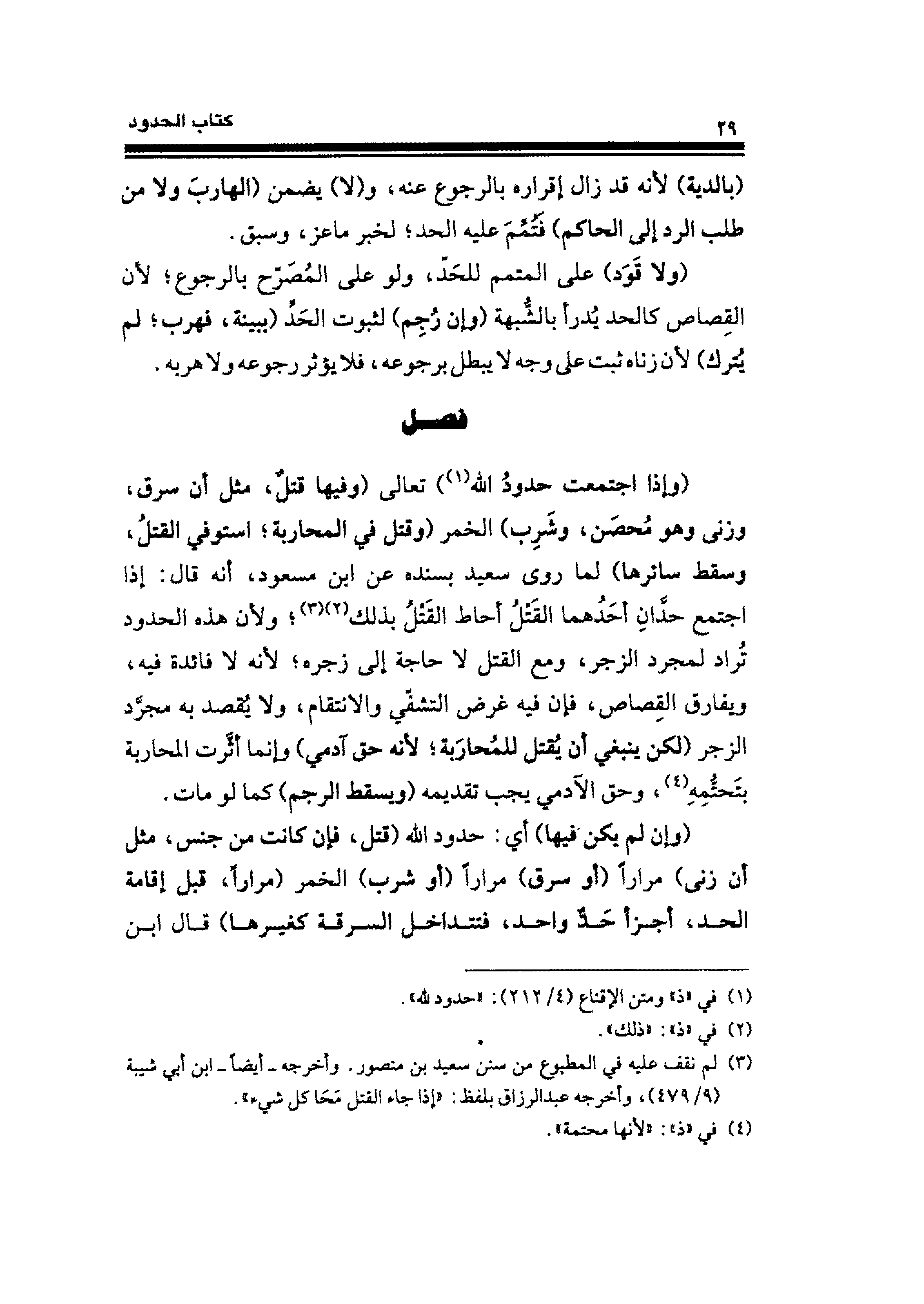 (وإذا اجتمعت حدودُ الله (¬١)) تعالى (وفيها قتلٌ، مثل أن سرق، وزنى وهو مُحصَن، وشَرِب) الخمر (وقتل في المحاربة؛ استوفى القتلُ، وسقط سائرها) لما روى سعيد بسنده عن ابن مسعود، أنه قال: إذا اجتمع حدَّانِ أحَدُهما القَتلُ أحاط القَتْلُ بذلك (¬٢) (¬٣)؛ ولأن هذه الحدود تُراد لمجرد الزجر، ومع القتل لا حاجة إلى زجره؛ لأنه لا فائدة فيه، ويفارق القِصاص، فإن فيه غرض التشفّي والانتقام، ولا يُقصد به مجرَّد الزجر (لكن ينبغي أن يُقتل للمُحارَبة؛ لأنه حق آدمي) وإنما أثَّرت المحاربة بتَحتُّمِهِ (¬٤)، وحق الآدمي بجب تقديمه (ويسقط الرجم) كما لو مات.