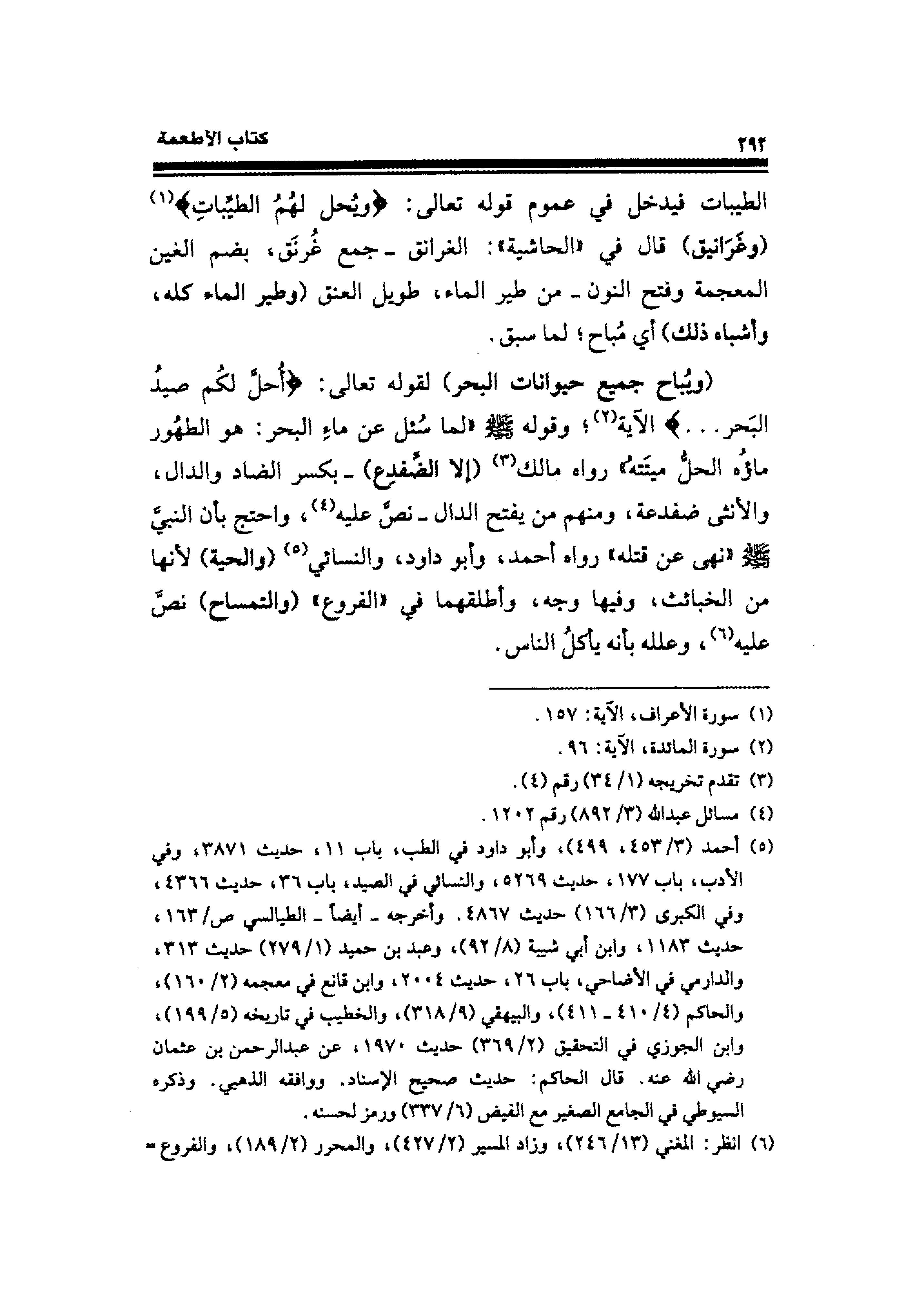 الطيبات فيدخل في عموم قوله تعالى: {وَيُحِلُّ لَهُمُ الطَّيِّبَاتِ} (¬١) (وغَرَانيق) قال في "الحاشية": الغرانق -جمع غُرنَق، بضم الغين المعجمة وفتح النون- من طير الماء، طويل العنق (وطير الماء كله، وأشباه ذلك) أي مُباح؛ لما سبق.