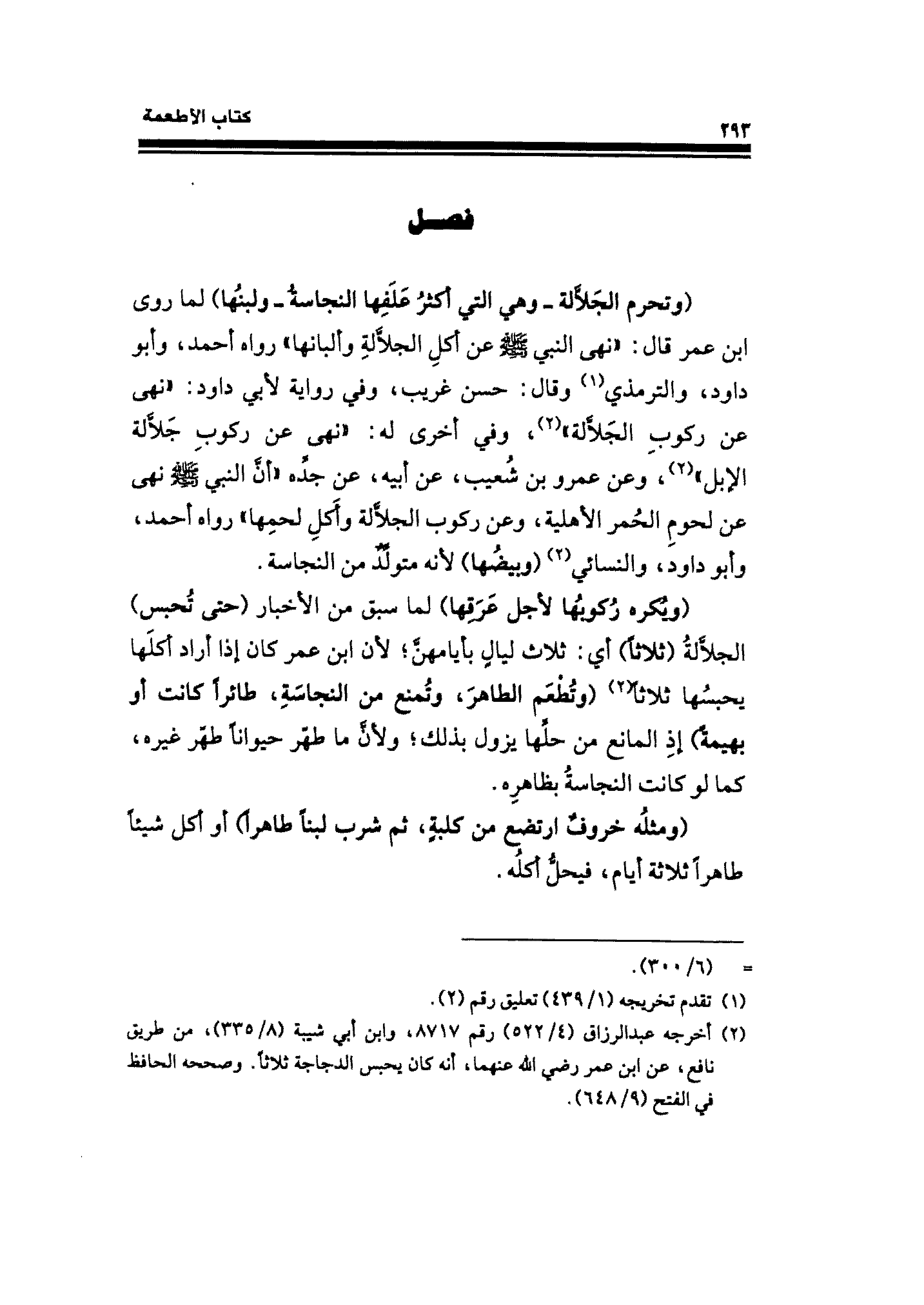 (وتحرم الجَلَّالة -وهي التي أكثرُ عَلَفِها النجاسةُ- ولبنُها) لما روى ابن عمر قال: "نهى النبي - صلى الله عليه وسلم - عن أكلِ الجلَّالةِ وألبانها" رواه أحمد، وأبو داود، والترمذي (¬١) وقال: حسن غريب، وفي رواية لأبي داود: " نهى عن ركوبِ الجَلَّالة" (¬٢)، وفي أخرى له: "نهى عن ركوبِ جَلَّالة الإبل" (¬٢)، وعن عمرو بن شُعيب، عن أبيه، عن جدِّه أن النبي - صلى الله عليه وسلم - نهى عن لحومِ الحُمر الأهلية، وعن ركوب الجلَّالة وأَكلِ لحمِها" رواه أحمد، وأبو داود، والنسائي ((¬٢)) (وبيضُها) لأنه متولِّدٌ من النجاسة.