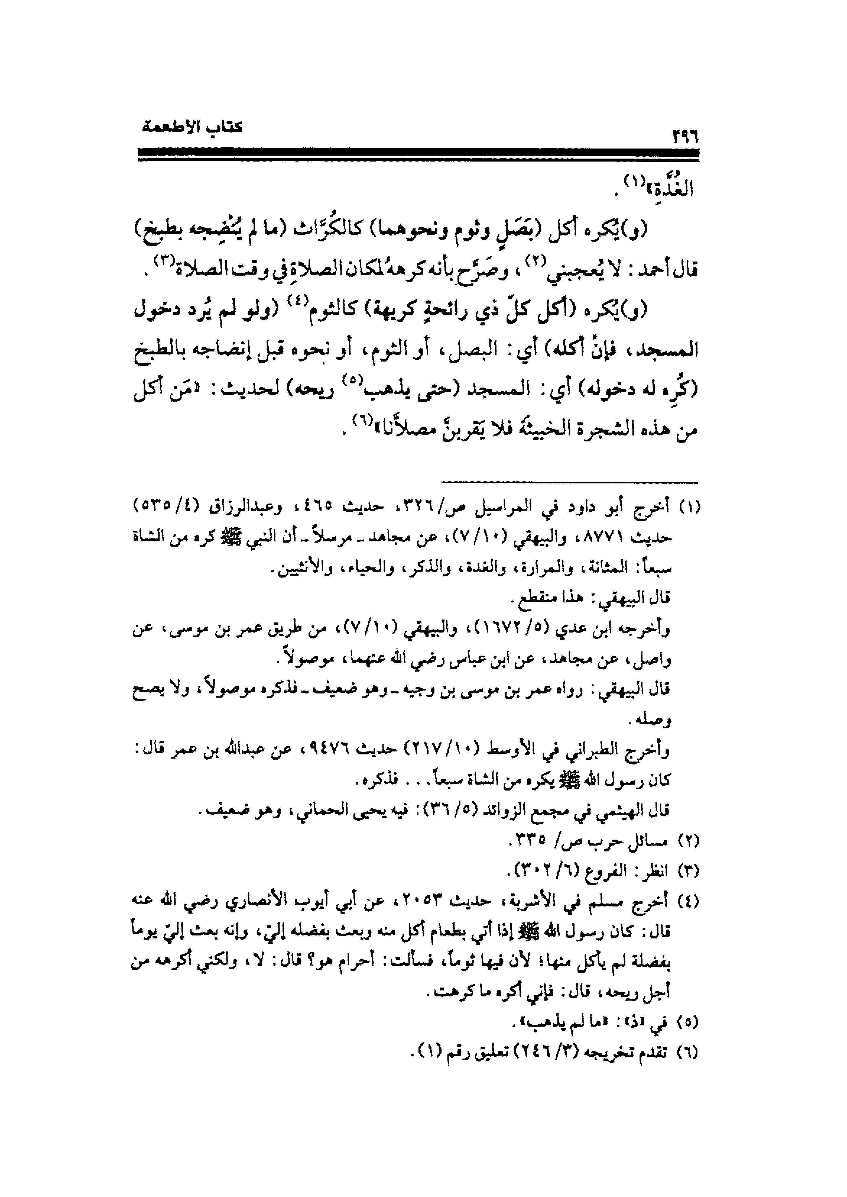 (¬٤) أخرج مسلم في الأشربة، حديث ٢٠٥٣، عن أبي أيوب الأنصاري - رضي الله عنه - قال: كان رسول الله - صلى الله عليه وسلم - إذا أتي بطعام أكل منه وبعث بفضله إلي، وإنه بعث إليّ يومًا بفضلة لم يأكل منها، لأن فيها ثومًا، فسألت: أحرام هو؟ قال: لا، ولكني أكرهه من أجل ريحه، قال: فإني أكره ما كرهت.