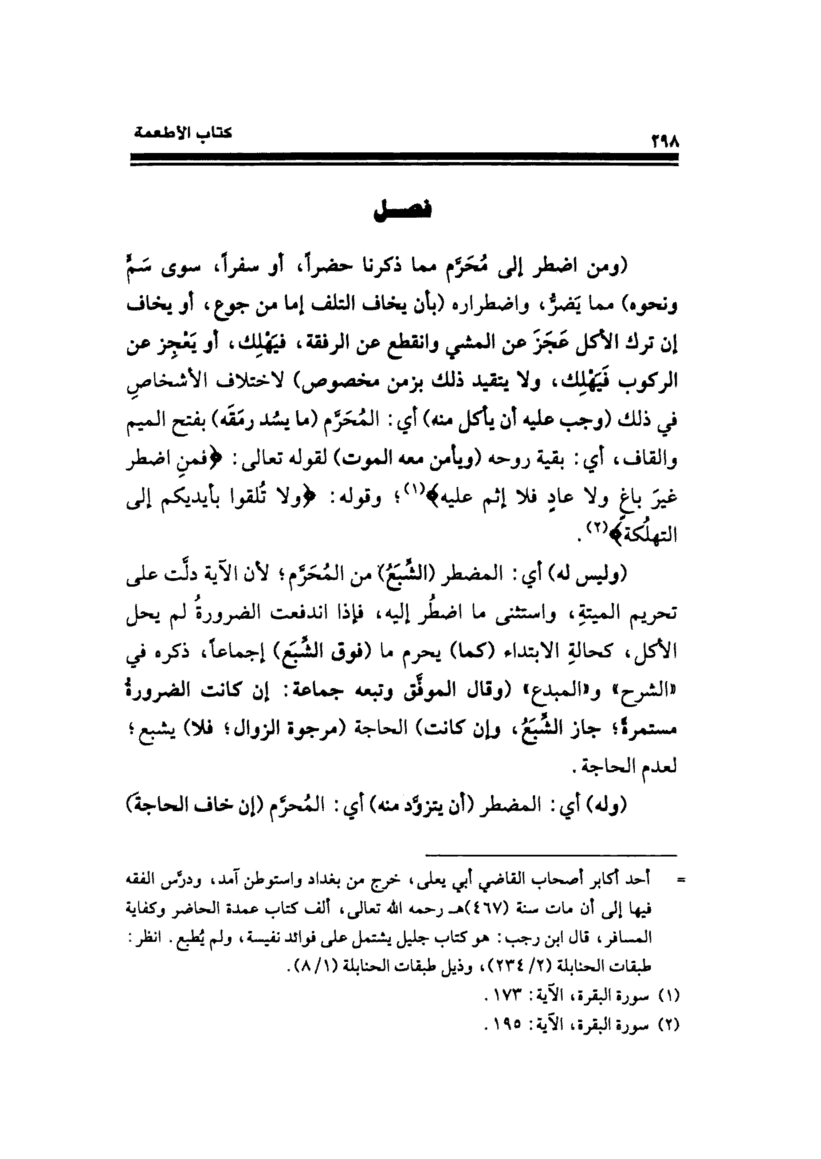 (ومن اضطر إِلَى مُحَرَّم مما ذكرنا حضرًا، أو سفرًا، سوى سَمٍّ ونحوه) مما يَضرُّ، واضطراره (بأن يخاف التلف إما من جوع، أو يخاف إن ترك الأكل عَجَزَ عن المشي وانقطع عن الرفقة، فيَهْلِك، أو يَعْجِز عن الركوب فَيَهْلِك، ولا يتقيد ذلك بزمن مخصوص) لاختلاف الأشخاصِ فِي ذلك (وجب عليه أن يأكل منه) أي: المُحَرَّم (ما يسُد رمَقَه) بفتح الميم والقاف، أي: بقية روحه (ويأمن معه الموت) لقوله تعالى: {فَمَنِ اضْطُرَّ غَيرَ بَاغٍ وَلَا عَادٍ فَلَا إِثْمَ عَلَيهِ} (¬١)؛ وقوله: {وَلَا تُلْقُوا بِأَيدِيكُمْ إِلَى التَّهْلُكَةِ} (¬٢).