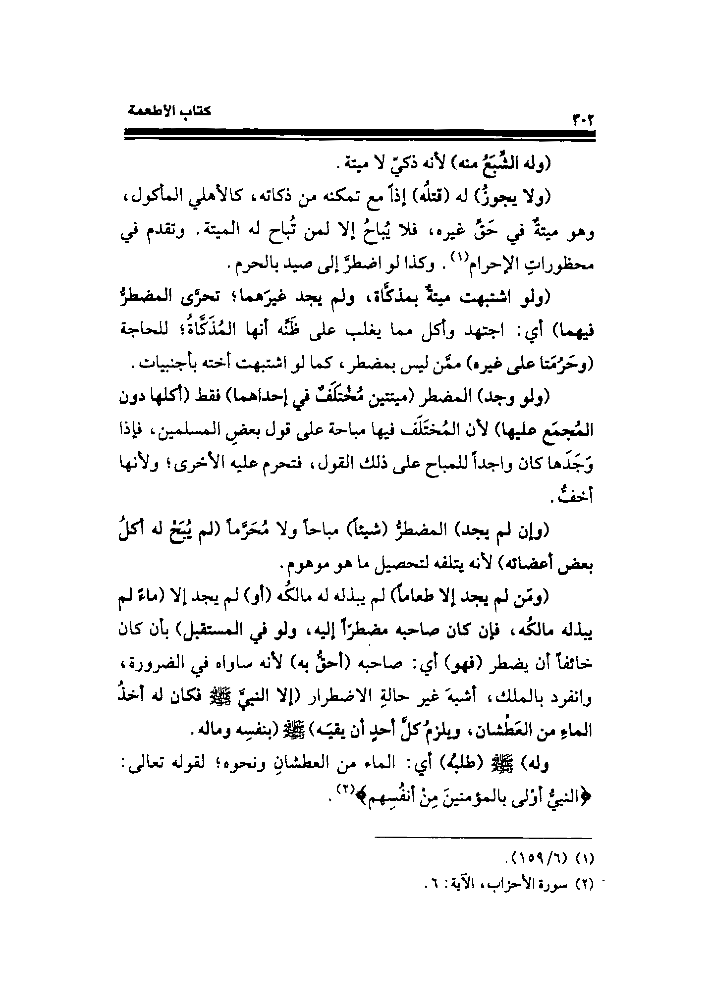 (ومَن لم يجد إلا طعامًا) لم يبذله له مالكُه (أو) لم يجد إلا (ماءً لم يبذله مالكُه، فإن كان صاحبه مضطرًّا إليه، ولو في المستقبل) بأن كان خائفًا أن يضطر (فهو) أي: صاحبه (أحقُّ به) لأنه ساواه فِي الضرورة، وانفرد بالملك، أشبهَ غير حالةِ الاضطرار (إلا النبيَّ - صلى الله عليه وسلم - فكان له أخذُ الماءِ من العَطْشان، ويلزمُ كلَّ أحدٍ أن يقيَه) - صلى الله عليه وسلم - (بنفسِه وماله.