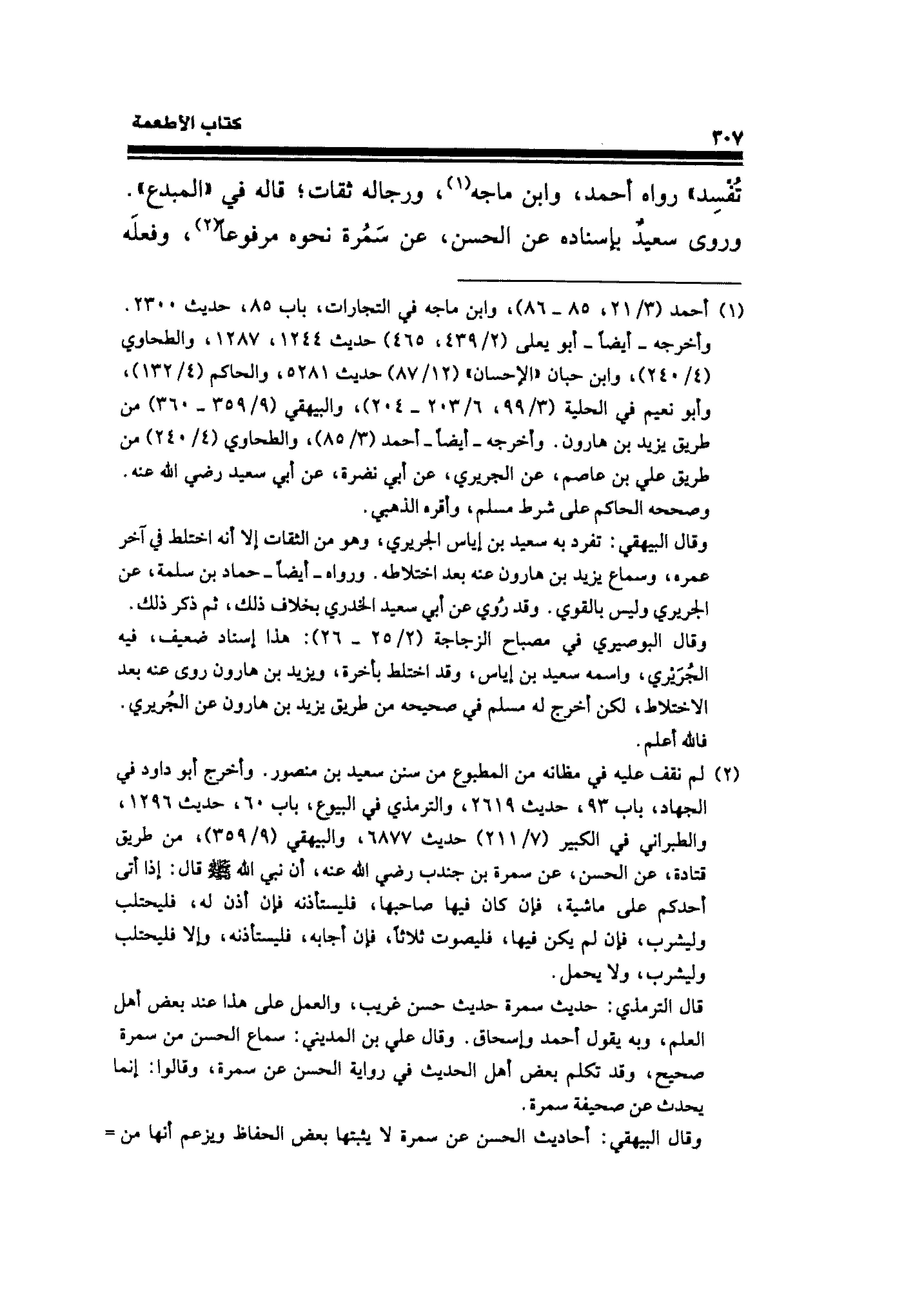 (¬١) أَحْمد (٣/ ٢١، ٨٥ - ٨٦)، وابن ماجه فِي التجارات، باب ٨٥، حديث ٢٣٠٠. وأخرجه -أيضًا- أبو يعلى (٢/ ٤٣٩، ٤٦٥) حديث ١٢٤٤، ١٢٨٧، والطحاوي (٤/ ٢٤٠)، وابن حبان "الإحسان" (١٢/ ٨٧) حديث ٥٢٨١، والحاكم (٤/ ١٣٢)، وأبو نعيم في الحلية (٣/ ٩٩، ٦/ ٢٠٣ - ٢٠٤)، والبيهقي (٩/ ٣٥٩ - ٣٦٠) من طريق يزيد بن هارون. وأخرجه -أيضًا- أَحمد (٣/ ٨٥)، والطحاوي (٤/ ٢٤٠) من طريق علي بن عاصم، عن الجريري، عن أبي نضرة، عن أبي سعيد - رضي الله عنه -.