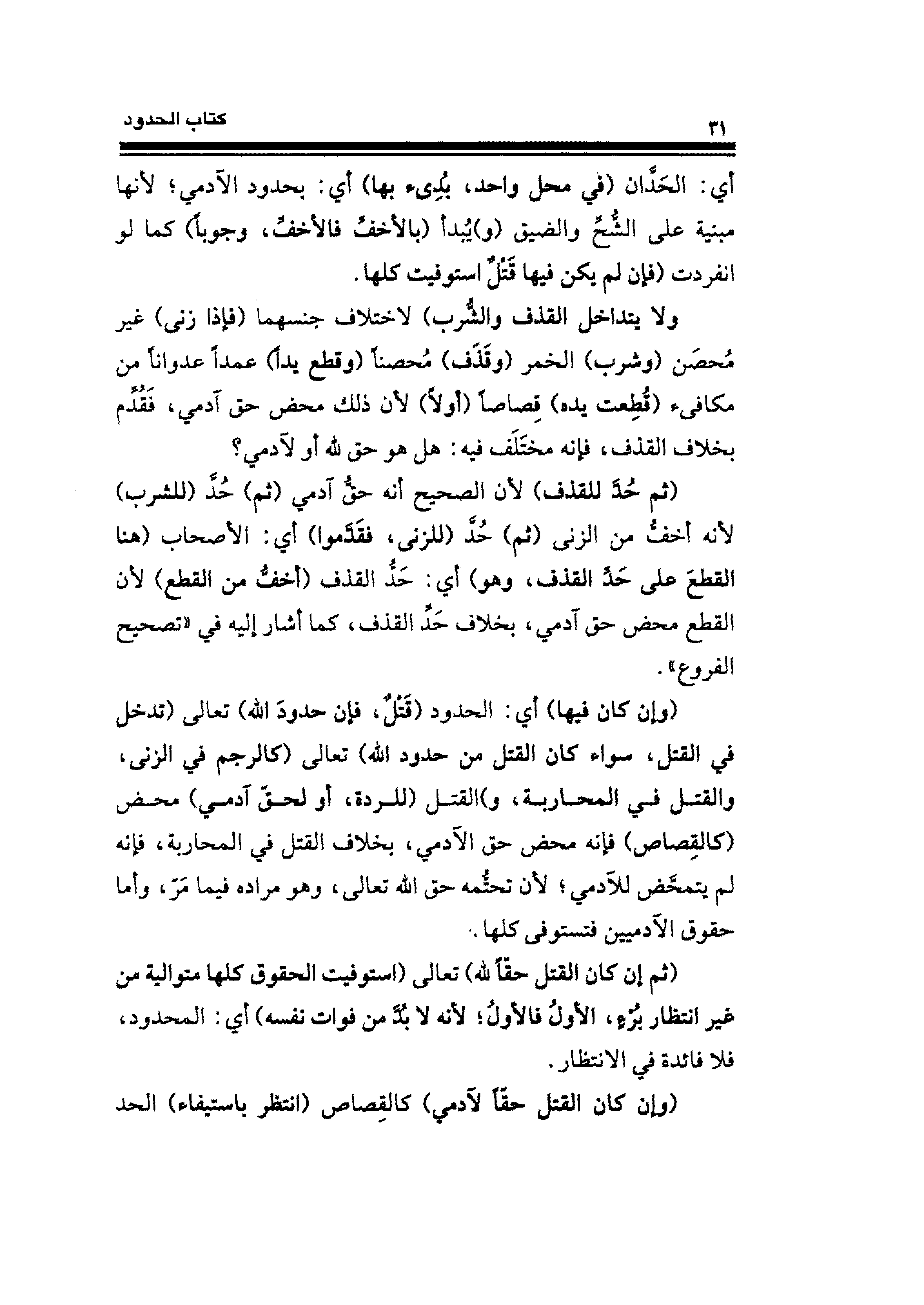 (وإن كان فيها) أي: الحدود (قَتلٌ، فإن حدودَ الله) تعالى (تدخل في القتل، سواء كان القتل من حدرد الله) تعالى (كالرجم في الزنى، والقتل في المحاربة، و) القتل (للردة، أو لحق آدمي) محض (كالقِصاص) فإنه محض حق الآدمي، بخلاف القتل في المحاربة، فإنه لم يتمحَّض للادمي؛ لأن تحتُّمه حق الله تعالى، وهو مراده فيما مَرّ، وأما حقوق الآدميين فتستوفى كلها.
