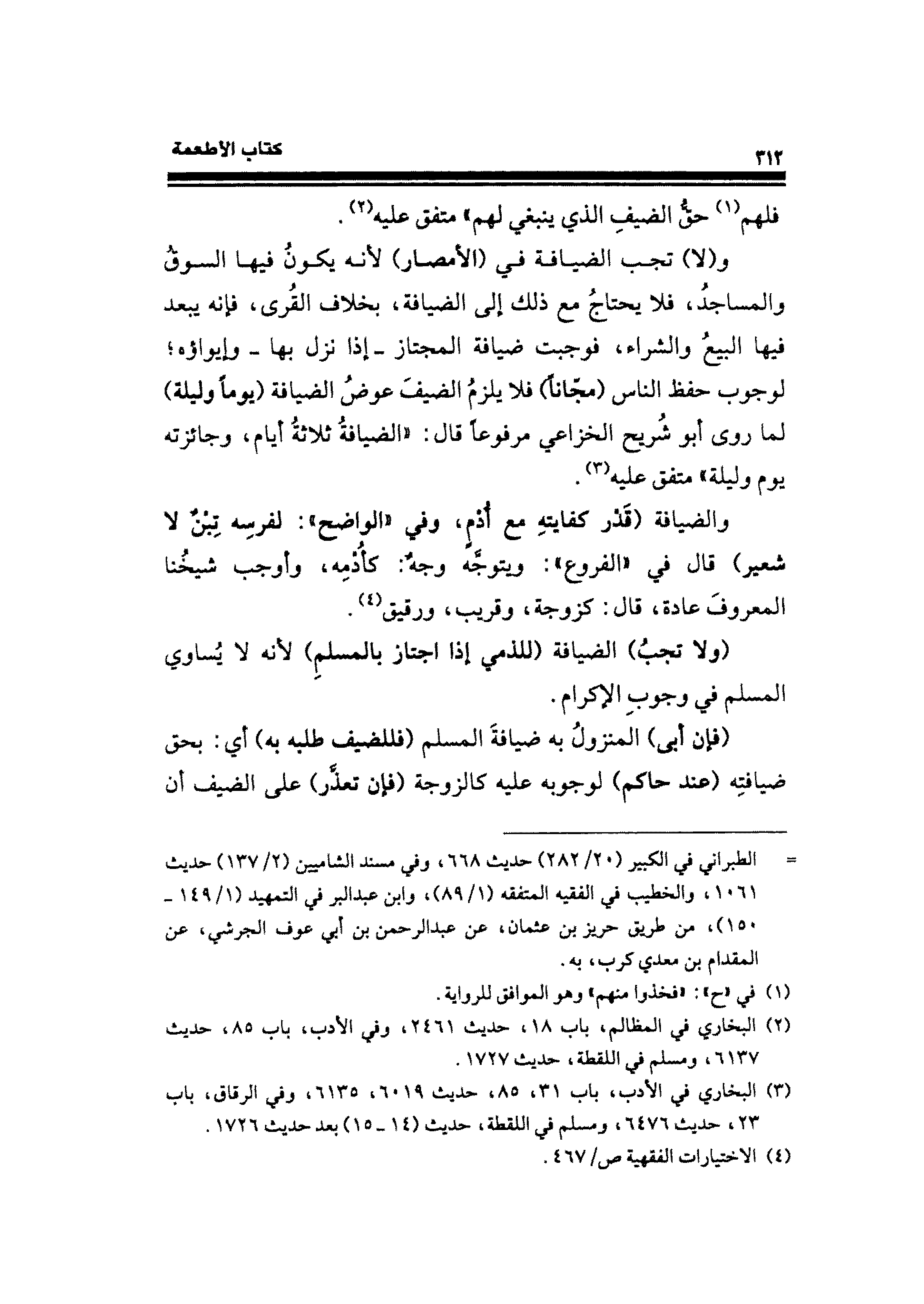 و (لا) تجب الضيافة في (الأمصار) لأنه يكون فيها السوقُ والمساجدُ، فلا يحتاجُ مع ذلك إلى الضيافة، بخلاف القُرى، فإنه يبعد فيها البيعُ والشراء، فوجبت ضيافة المجتاز -إذا نزل بها- وإيواؤه؛ لوجوب حفظ الناس (مجّانًا) فلا يلزم الضيفَ عوضُ الضيافة (يومًا وليلة) لما روى أبو شُريح الخزاعي مرفوعًا قال: "الضيافة ثلاثةُ أيام، وجائزته يوم وليلة" متفق عليه (¬٣).