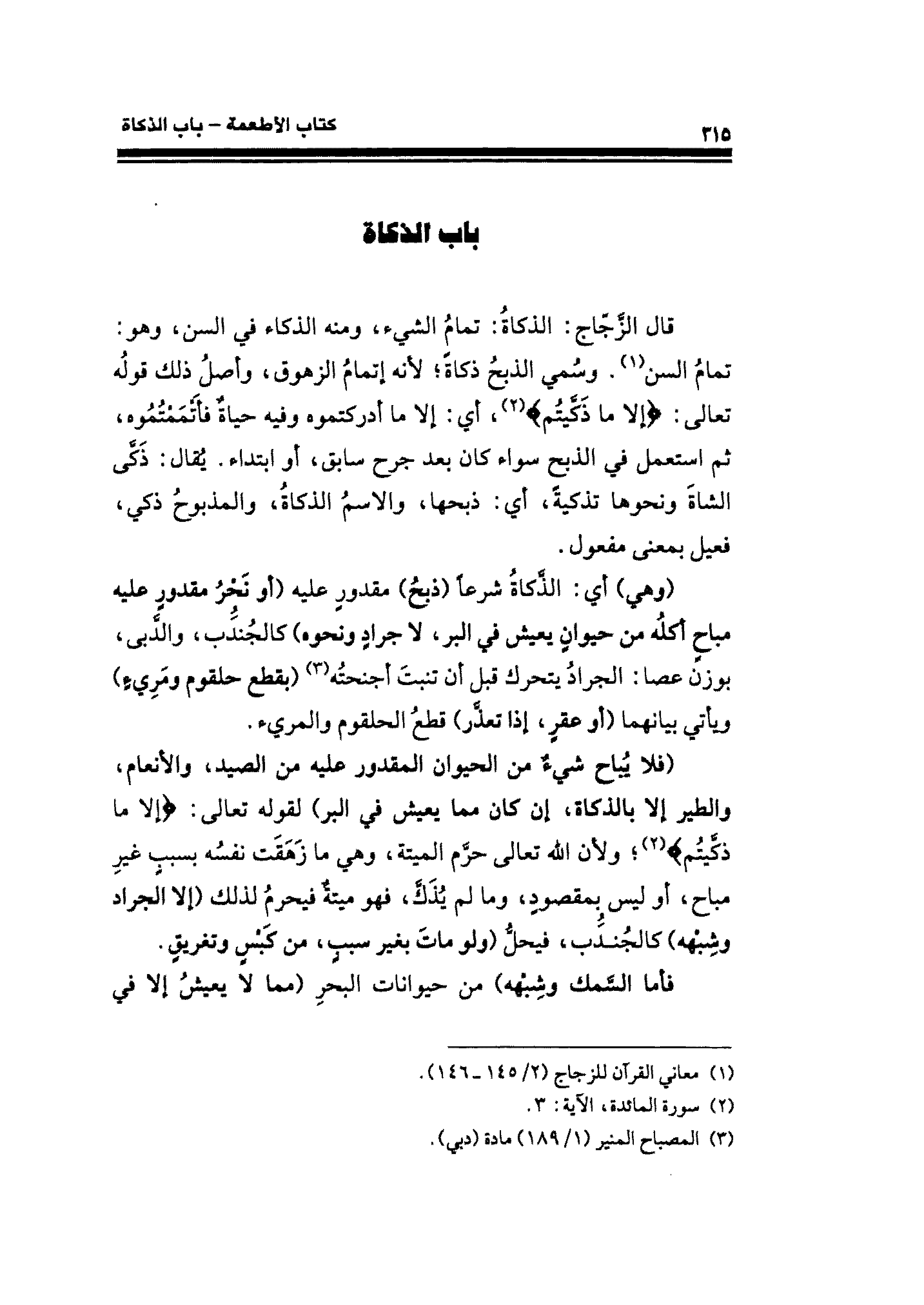 قال الزَّجَّاج: الذكاة: تمام الشيء، ومنه الذكاء في السن، وهو: تمام السنن (¬١). وسمي الذبح ذكاةً؛ لأنه إتمام الزهوق، وأصل ذلك قولُه تعالى: {إلا مَا ذَكَّيتُمْ} (¬٢)، أي: إلا ما أدركتموه وفيه حياةٌ فأتممتموه، ثم استعمل في الذبح سواء كان بعد جرح سابق، أو ابتداء. يُقال: ذَكَّى الشاةَ ونحوها تذكيةً، أي: ذبحها، والاسم الذكاةُ، والمذبوح ذكي، فعيل بمعنى مفعول.