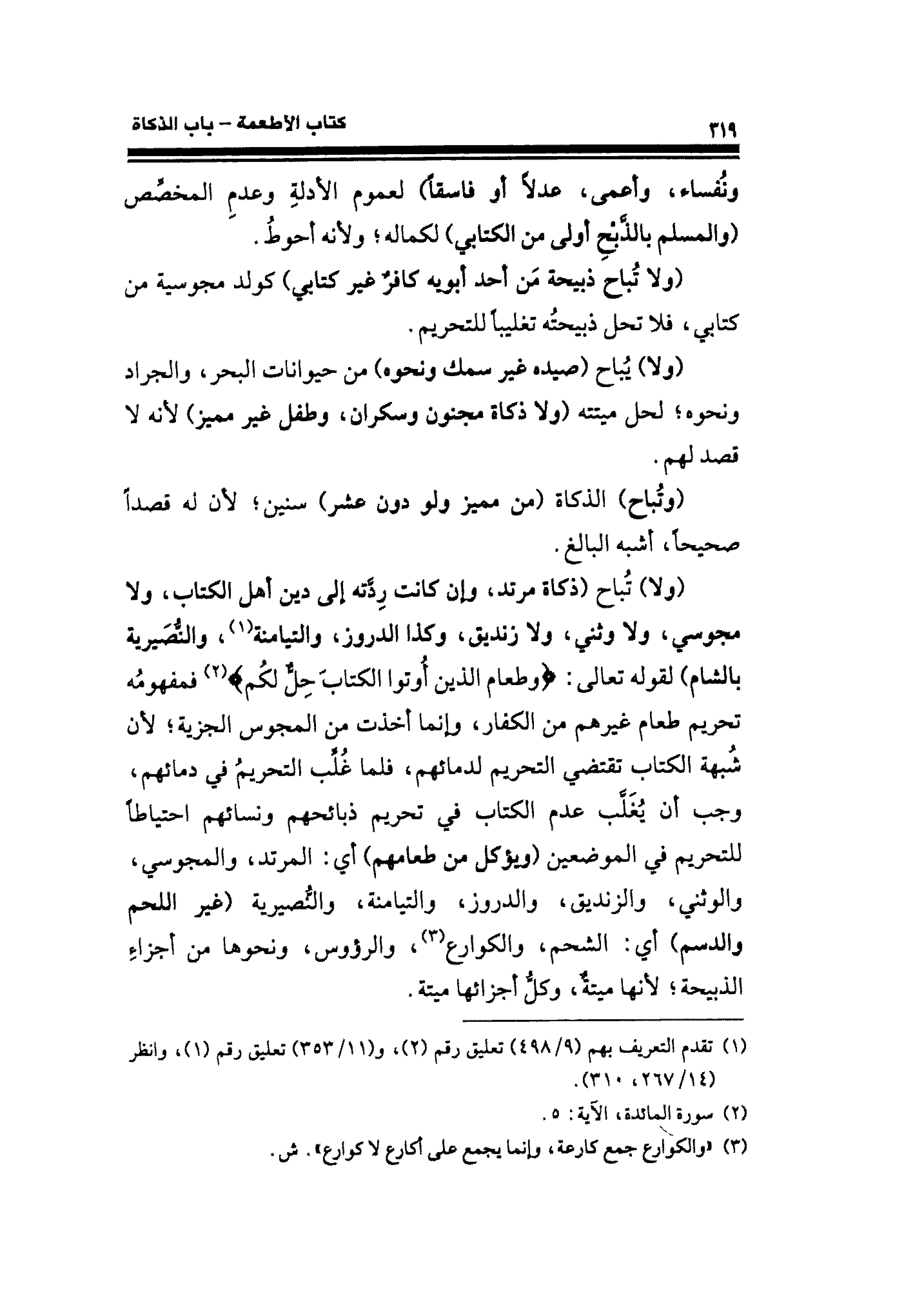 (ولا) تُباح (ذكاة مرتد، وإن كانت رِدَّته إلى دين أهل الكتاب، ولا مجوسي، ولا وثني، ولا زنديق، وكذا الدروز، والتيامنة (¬١)، والنُّصَيرية بالشام) لقوله تعالى: {وَطَعَامُ الَّذِينَ أُوتُوا الْكِتَابَ حِلٌّ لَكُمْ} (¬٢) فمفهومُه تحريم طعام غيرهم من الكفار، وإنما أخذت من المجوس الجزية؛ لأن شُبهة الكتاب تقتضي التحربم لدمائهم، فلما غُلِّب التحريمُ في دمائهم، وجب أن يُغَلَّب عدم الكتاب في تحريم ذبائحهم ونسائهم احتياطًا للتحريم في الموضعين (ويؤكل من طعامهم) أي: المرتد، والمجوسي، والوثني، والزنديق، والدروز، والتيامنة، والنُّصيرية (غير اللحم والدسم) أي: الشحم، والكوارع (¬٣)، والرؤوس، ونحوها من أجزاءِ الذبيحة؛ لأنها ميتةٌ، وكلُّ أجزائها ميتة.