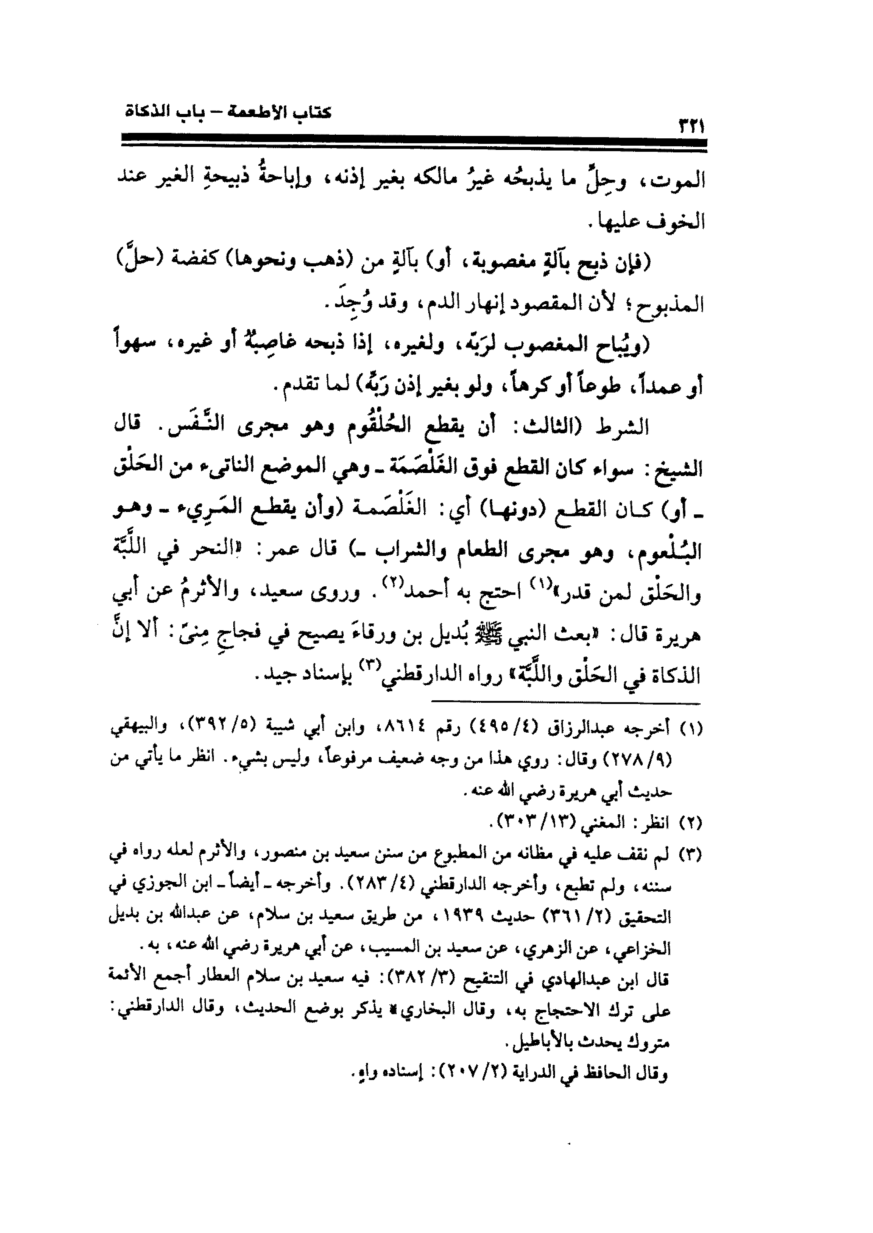 الشرط (الثالث: أن يقطع الحُلْقُوم وهو مجرى النَّفَس. قال الشيخ: سواء كان القطع فوق الغَلْصَمَة -وهي الموضع الناتيء من الحَلْق -أو) كان القطع (دونها) أي: الغَلْصَمة (وأن يقطع المَريء -وهو البُلْعوم، وهو مجرى الطعام والشراب-) قال عمر: "النحر في اللَّبَّة والحَلْق لمن قدر" (¬١) احتج به أحمد (¬٢). وروى سعيد، والأثرمُ عن أبي هريرة قال: "بعث النبي - صلى الله عليه وسلم - بُديل بن ورقاءَ يصيح في فجاجِ مِنىً: ألا إنَّ الذكاة في الحَلْق واللَّبَّة" رواه الدارقطني (¬٣) بإسناد جيد.