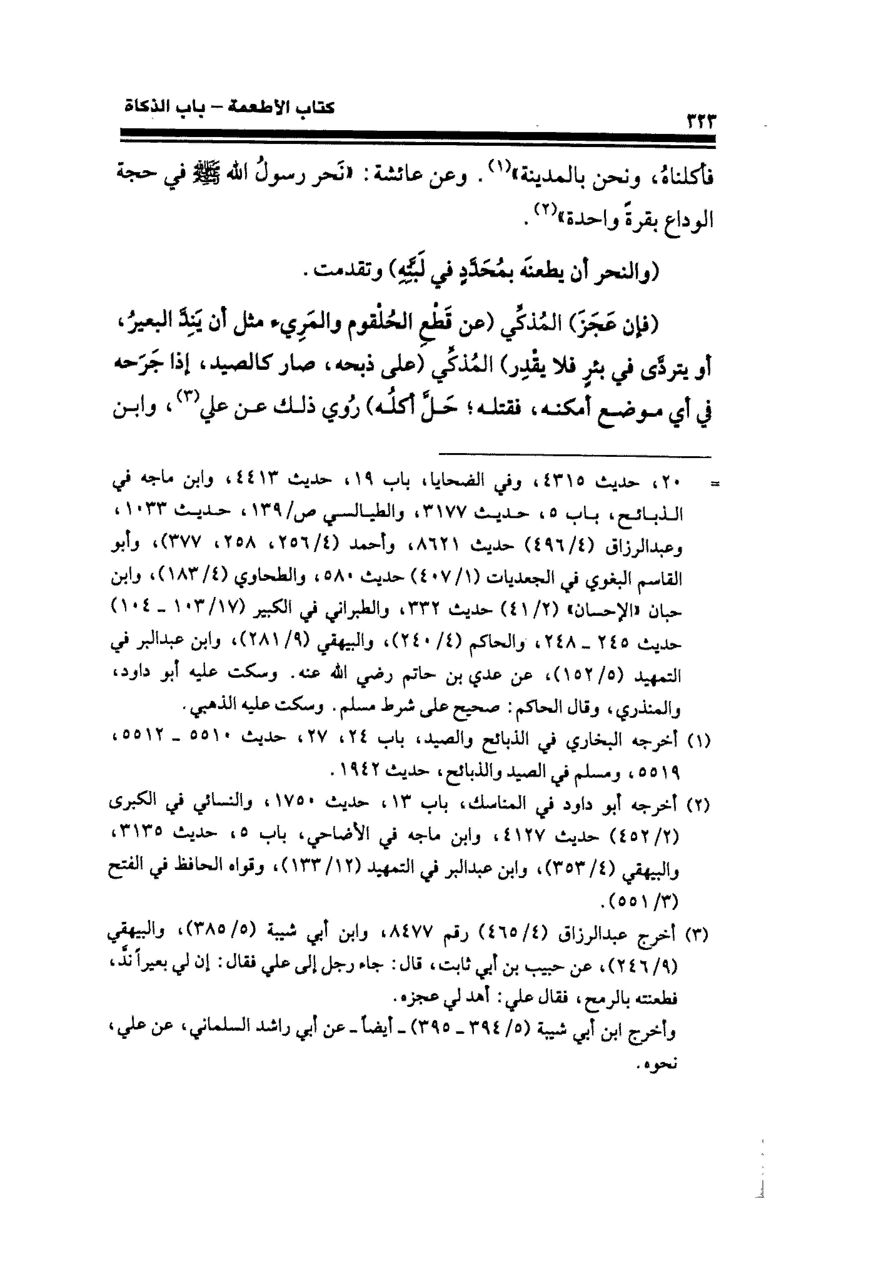 (¬٣) أخرج عبد الرزاق (٤/ ٤٦٥) رقم ٨٤٧٧، وابن أبي شيبة (٥/ ٣٨٥)، والبيهقي (٩/ ٢٤٦)، عن حبيب بن أبي ثابت، قال: جاء رجل إلى علي فقال: إن لي بعيرًا ندَّ، فطعنته بالرمح، فقال علي: أهد لي عجزه.