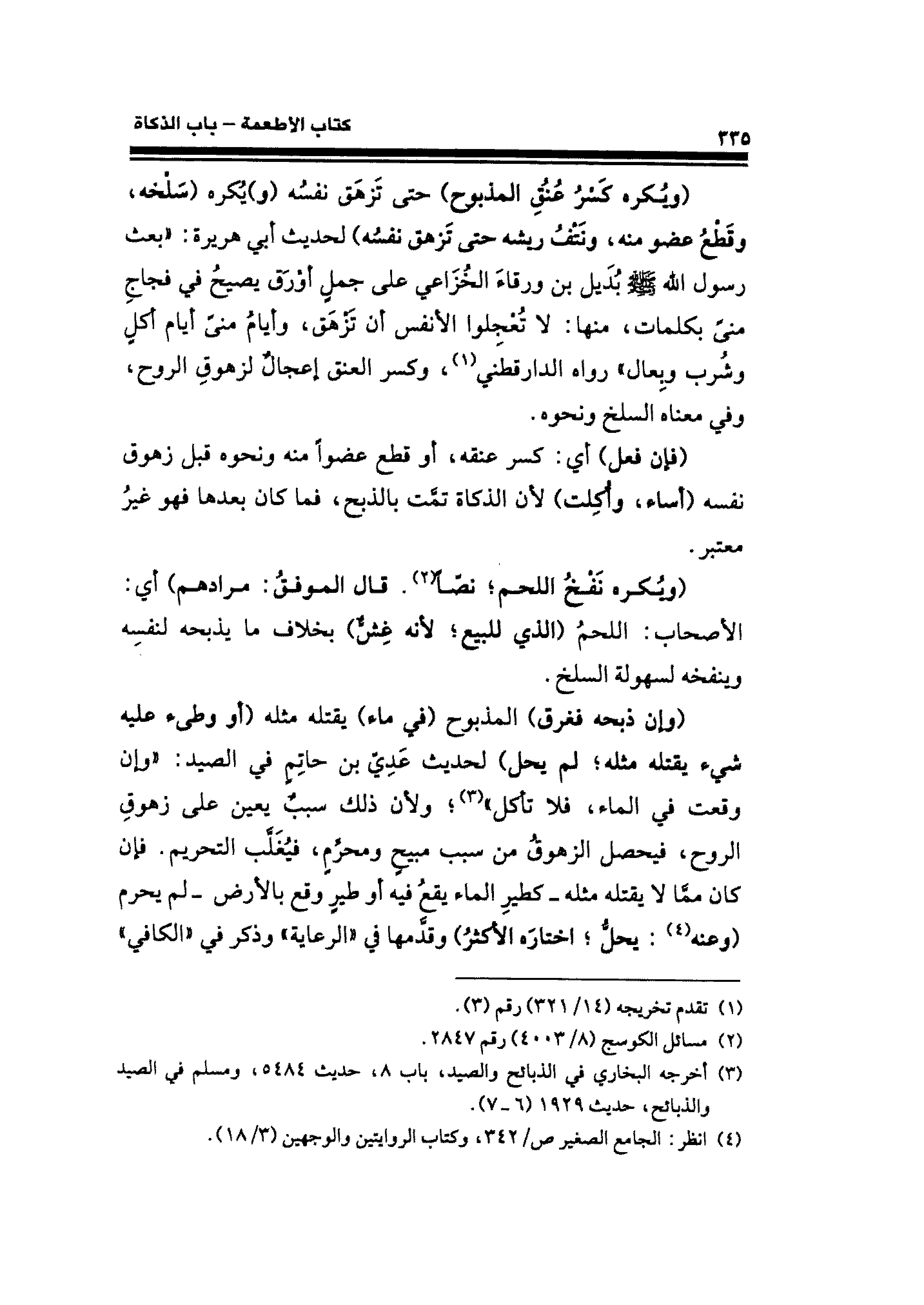 (ويكره كسر عنق المذبوح) حتى تزهَق نفسه (و) يكره (سَلخه، وقطعُ عضو منه، ونتف ريشه حتى تزهق نفسه) لحديث أبي هريرة: "بعث رسول الله - صلى الله عليه وسلم - بُدَيل بن ورقاءَ الخُزاعي على جملٍ أروَق يصيحُ في فجاج منى بكلمات، منها: لا تُعجِلوا الأنفس أن تزَهق، وأيام منى أيَّام أكل وشرب وبعال" رواه الدارقطني (¬١)، وكسر العنق إعجالٌ لزهوقِ الروح، وفي معناه السلخ ونحوه.