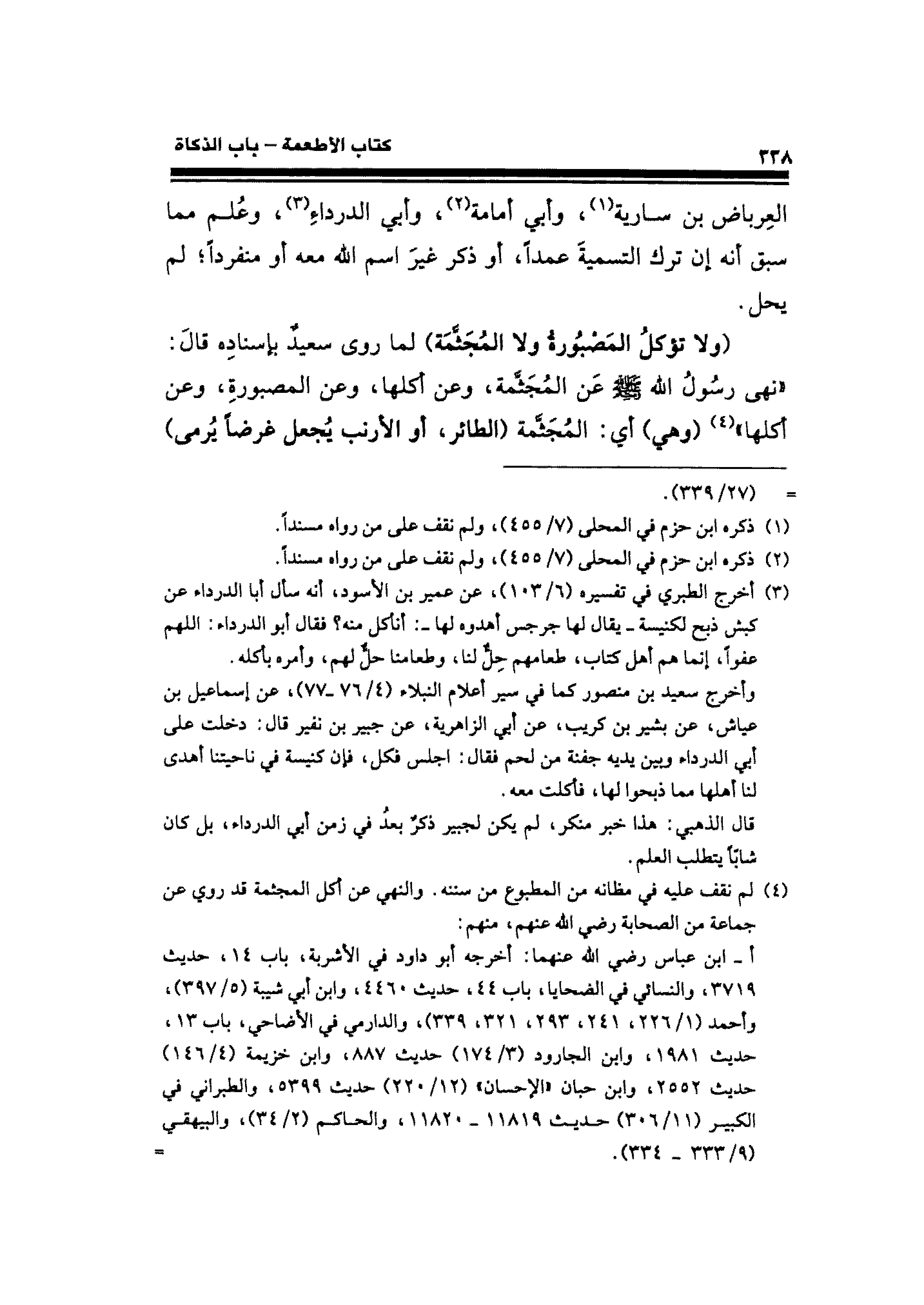(¬٤) لم نقف عليه في مظانه عن المطبوع من سننه. والنهي عن أكل المجثمة قد روي عن جماعة من الصحابة رضي الله عنهم، منهم: