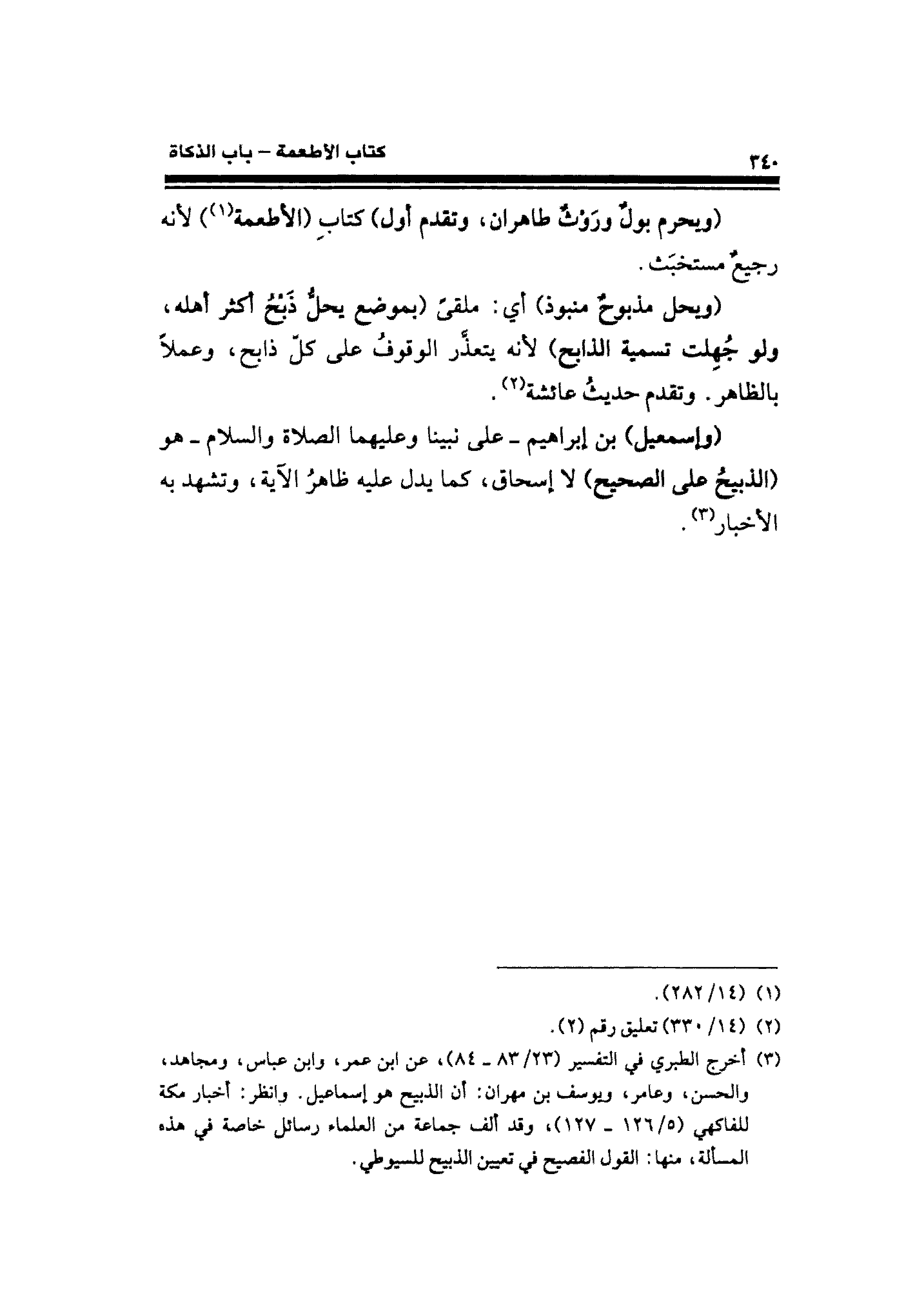 (¬٣) أخرج الطبري في التفسير (٢٣/ ٨٣ - ٨٤)، عن ابن عمر، وابن عباس، ومجاهد، والحسن، وعامر، ويوسف بن مهران: أن الذبيح هو إسماعيل. وانظر: أخبار مكة للفاكهي (٥/ ١٢٦ - ١٢٧)، وقد ألف جماعة من العلماء رسائل خاصة في هذه المسألة، منها: القول الفصيح في تعيين الذبيح للسيوطي.