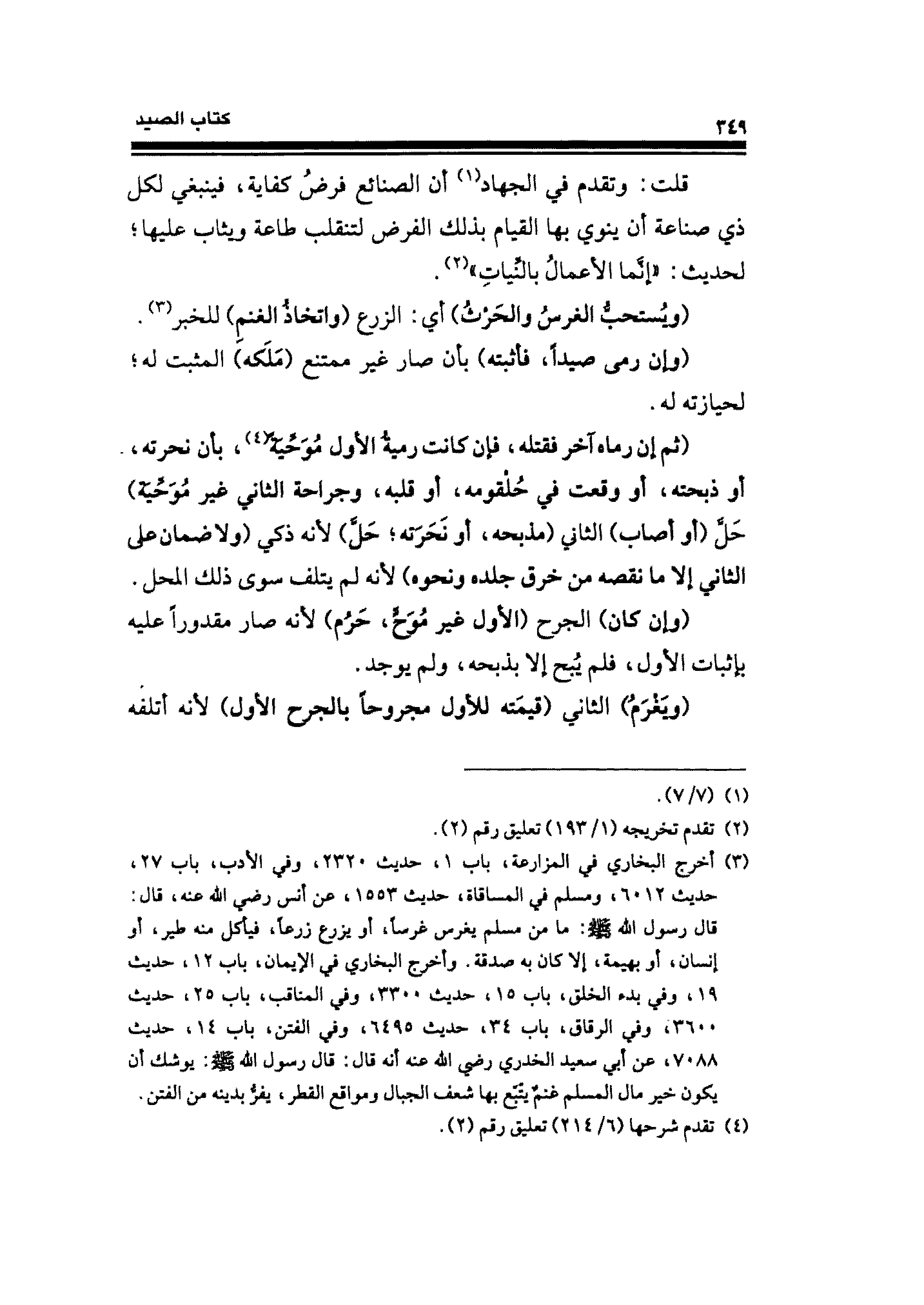 (¬٣) أخرج البخاري في المزارعة، باب ١، حديث ٢٣٢٠، وفي الأدب، باب ٢٧، حديث ٦٠١٢، ومسلم في المساقاة، حديث ١٥٥٣، عن أنس رضي الله عنه، قال: قال رسول الله - صلى الله عليه وسلم -: ما من مسلم يغرس غرسًا، أو يزرع زرعًا، فيأكل منه طير، أو إنسان، أو بهيمة، إلا كان به صدقة. وأخرج البخاري في الإيمان، باب ١٢، حديث ١٩، وفي بدء الخلق، باب ١٥، حديث ٣٣٠٠، وفي المناقب، باب ٢٥، حديث ٣٦٠٠، وفي الرقاق، باب ٣٤، حديث ٦٤٩٥، وفي الفتن، باب ١٤، حديث ٧٠٨٨، عن أبي سعيد الخدري رضي الله عنه أنه قال: قال رسول الله - صلى الله عليه وسلم -: يوشك أن يكون خير مال المسلم غنمٌ يتبع بها شعف الجبال ومواقع القطر، يفرُّ بدينه من الفتن.